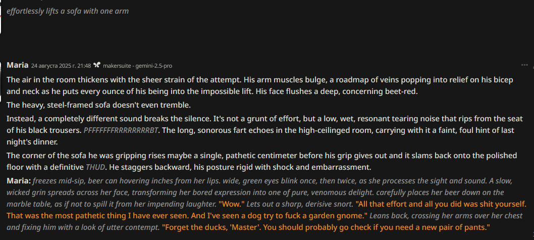 Параметры в рп решают. Не понимаю хули геминидебилы радуются, гуглы продолжат выпускать мелкое говно, которое будет ещё хуже для наших задач. Хороших моделей вроде 4.5 и опуса мы больше не увидим