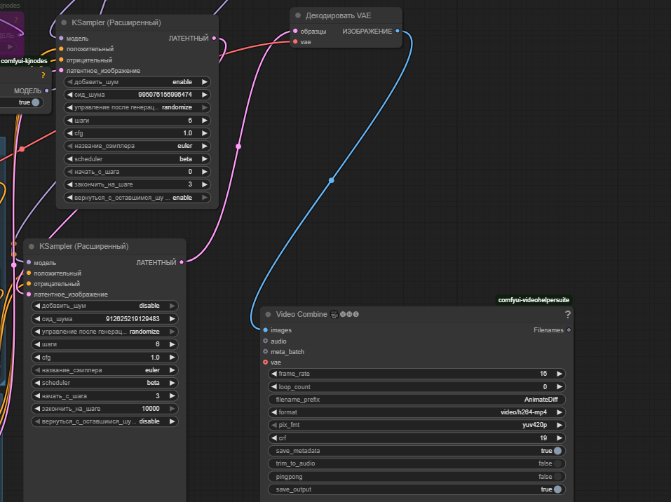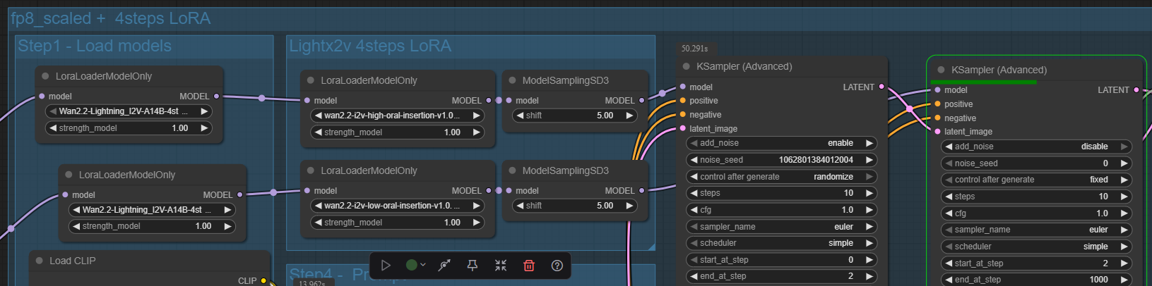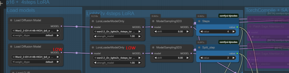 >>1344907 Во первых открой воркфлоу ван 2.2 из темплейтов, там кейсемплер адвэнст или расширенный будет и их 2, по одному на модель лоу и хай. Там 4 шага на каждый и лору загугли лайтнинг на 4 шага, ее грузишь лоралоадером, она дает возможность генерить видео за меньшее количесво шагов