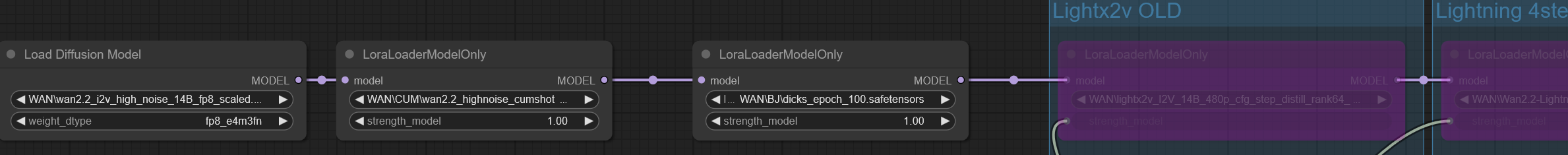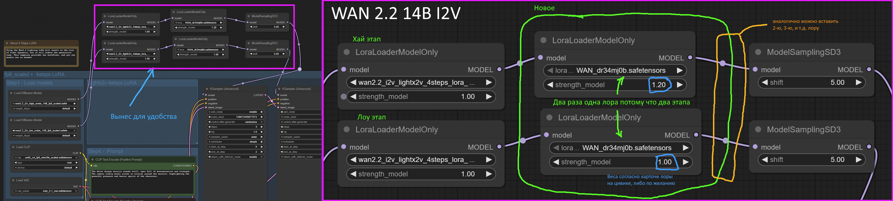 >>1344934 >порог вхождения >Во первых открой воркфлоу ван 2.2 из темплейтов, там кейсемплер адвэнст или расширенный будет и их 2, по одному на модель лоу и хай. Там 4 шага на каждый и лору загугли лайтнинг на 4 шага, ее грузишь лоралоадером, она дает возможность генерить видео за меньшее количесво шагов Это и есть порог вхождения. Я бы не знал - нихуя не понял бы. Это традиция двача - из треда в тред зелень кормить блатным порожняком уровня малолетки. Если бы мы были попроще и хотя бы писали названия как есть, а не двачезябрами, то цены бы этим доскам не было. И даже разобрав твой пост лексически, он не бьется с тем, что сейчас в комфи. Ему не надо гуглить лайтинг 4 шага, потому что она уже есть в шаблоне. Все, что ему надо (при условии что дефолтный "WAN 2.2 14B Image to Video" воркфлоу работает), это: - скачать ван лору с цивитая https://civitai.com/search/models?baseModel=Wan%20Video&modelType=LORA&sortBy=models_v9 - положить ее в ComfyUI\models\loras\хуи-малафья.safetensors - в воркфлоу вставить ее в разрыв согласно пикрилу Изначально этой лоры не будет в элементе выбора, т.к. уи даунский. Так что придется открыть сайдбар Models, нажать кнопку обновить, зайти в loras, найти и перетащить нужную лору на две новые ноды. При следующем старте комфи ее уже можно будет менять/выбирать нормально.