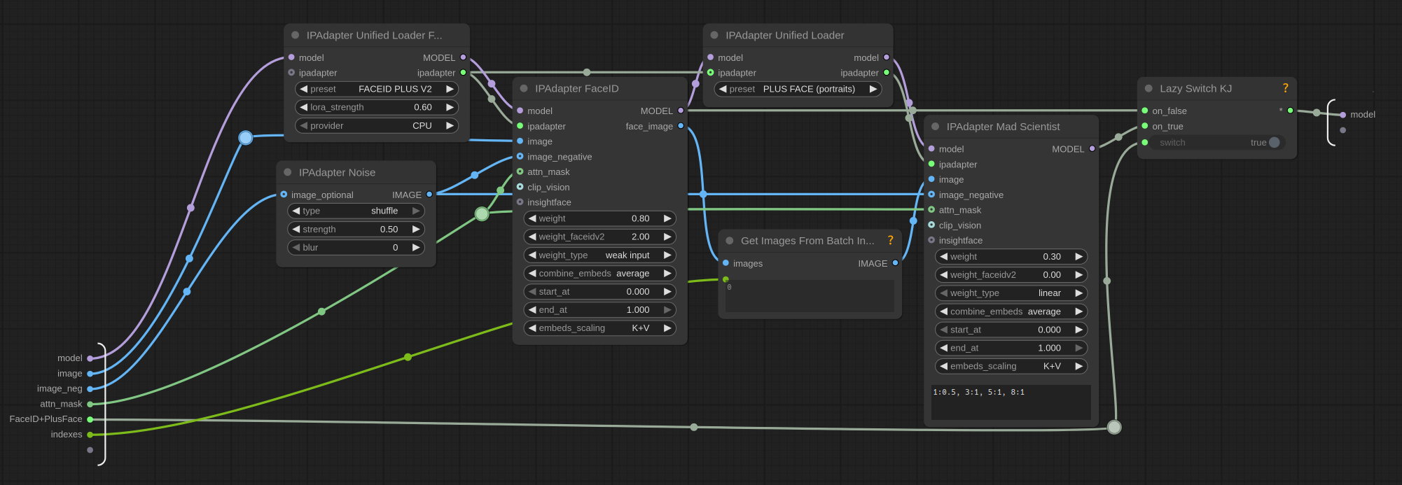>>1330800 Поделись, пожалуйста, своим конфигом для face_id. У меня пока что мордовки какие то ебучие получаются. Какие веса используешь, что в самом IPadapter прописано, в семплере, молю!