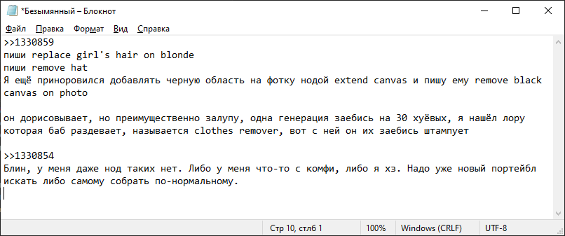 Народ, а вы вот что ищете в генерациях? Вот чисто для себя. Я вот ищу сходство с реальностью, чтоб бабы, сгенерированные мною, были похожи как на настоящих. Настоящих отношений я больше не хочу, мозгоёбства. А тут ты вроде как повелитель фоток, делаешь что хочешь с ними. Типа, как воля к власти, что ли. А ещё эскапизм, я сьёбываюсь от реальности, генерируя всякую хуйню.