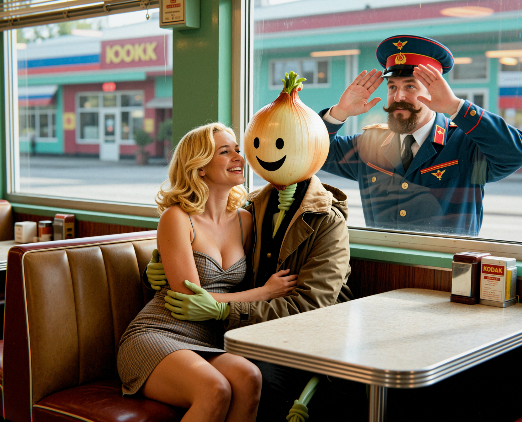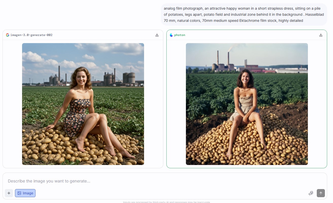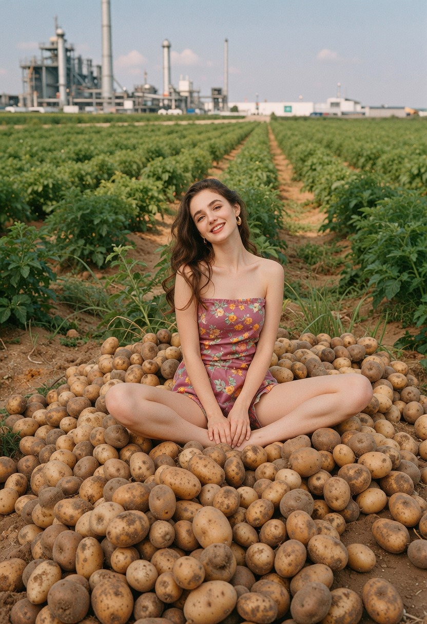 Похоже уперся либо в лимит того, что qwen способен переварить, либо в 1 cfg. an attractive happy young adult woman in a short yellow strapless dress sitting on a pile of potatoes with her straight legs apart exposing her red and black stripped panties, potato field and industrial zone behind it in the background, in the foreground directly in front of the woman there is a marching band of rats dressed in Scottish kilts walking by and playing various tiny musical instruments including but not limited to drums and trumpets and bagpipes, to the left of the woman is a pterodactyl in a top hat standing on one leg and holding a grocery bag with a logo depicting Belorussian flag and text 'Батька inc.', and on the right side behind the woman there is a happy piglet driving in a red tractor