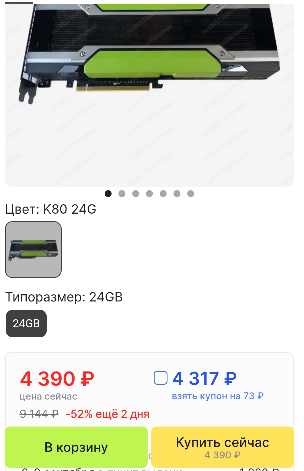 Вот сматри. Я беру с Алика Nvidia Tesla P40 24 Гб за 10к рублей. Видео выход из процесса. Норм? Какие подводные кроме шансов, что карта будет отоженная майнингом? Технически это выполнимо для генерации нейросетей?