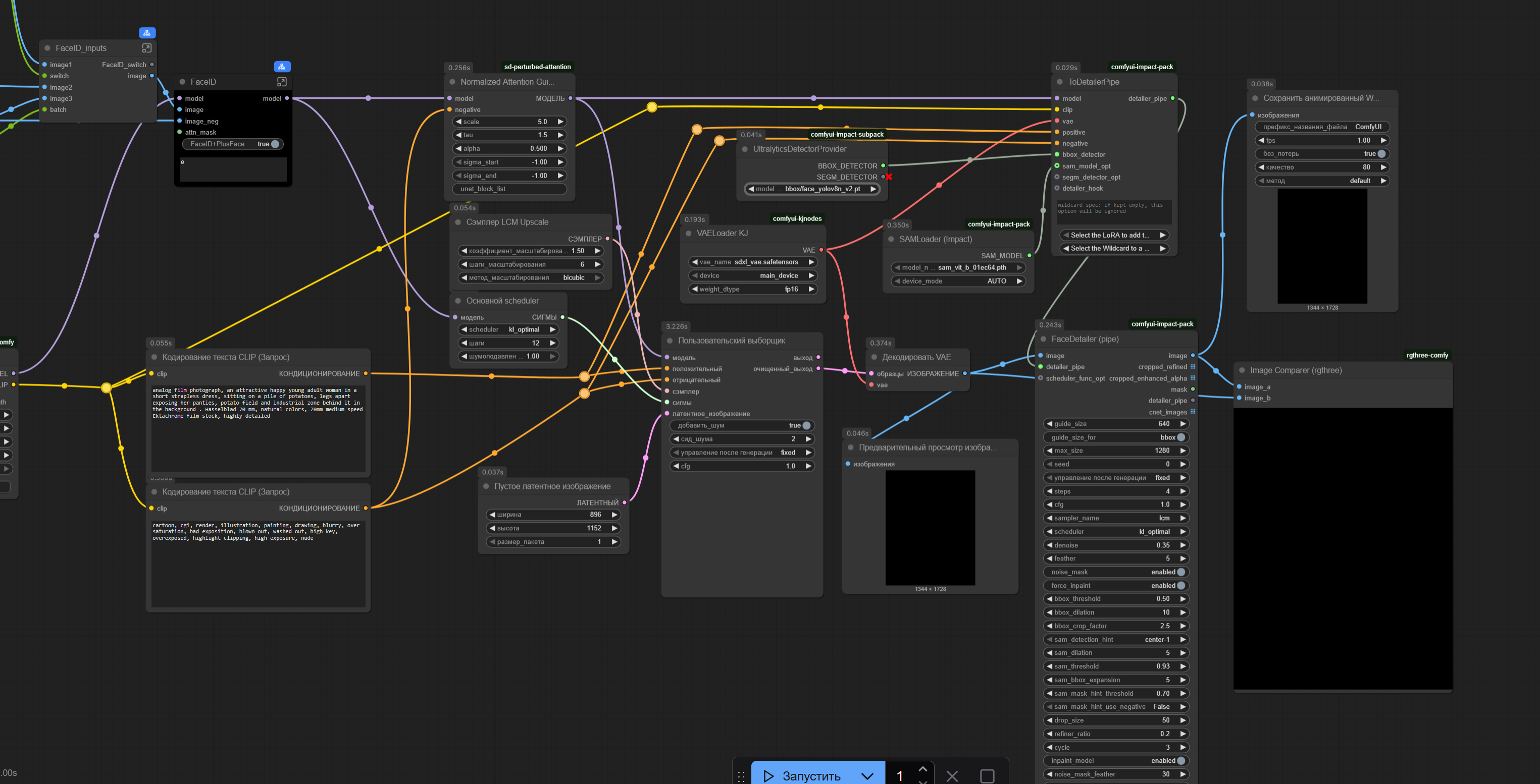 >>1331236 Чтобы UnifiedLoader правильно работал всё должно лежать в указанных https://github.com/cubiq/ComfyUI_IPAdapter_plus?tab=readme-ov-file#installation местах и с указанными именами. Конкретно для того воркфлоу нужно: models/clip_vision/CLIP-ViT-H-14-laion2B-s32B-b79K.safetensors models/ipadapter/ip-adapter-faceid-plusv2_sdxl.bin models/loras/ip-adapter-faceid-plusv2_sdxl_lora.safetensors models/ipadapter/ip-adapter-plus-face_sdxl_vit-h.safetensors