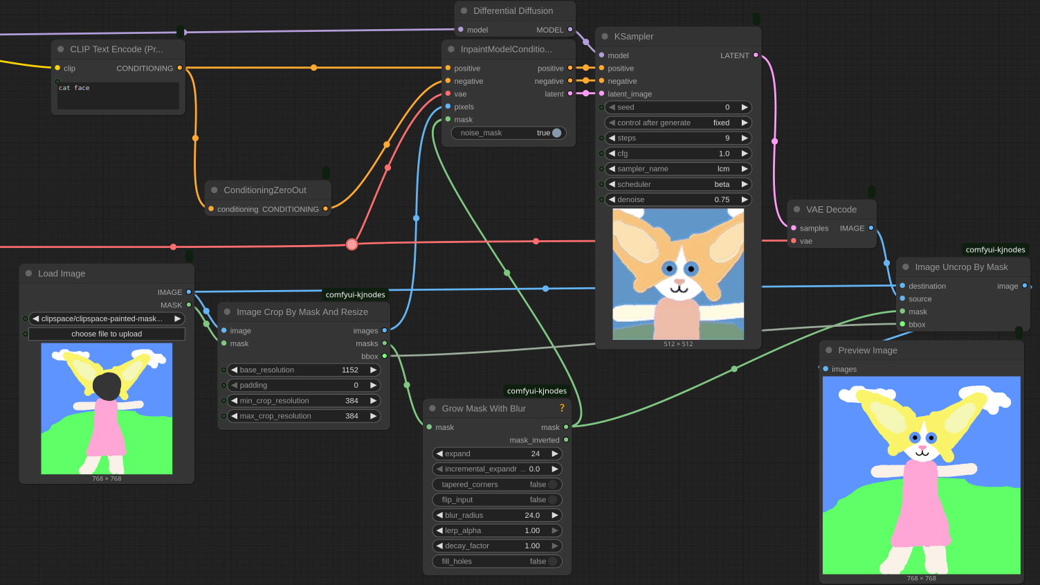 Представьте локальный инпаинт. Вот например я делаю инпаинт глаз или лица целиком и я вижу, что шаги инференса идут через всё разрешение картинки, а должно затрагивать только область инпаинта. Иначе никак не повысить качество деталей в больших картинках. Желательно без лишних нод. Только встроенными можно это сделать? Как автоматически кропать область инпаинта, ну вы понимаете. Спасибо.