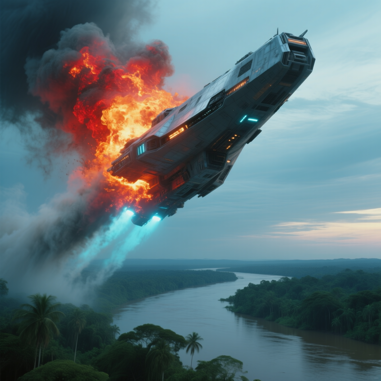 >>1332174 film still from 80s b-movie, a spaceship engulfed in flames performing a reentry over the amazon river . faded film, desaturated, 35 mm motion picture Ektachrome film stock, soft glare, cold colors, highly detailed