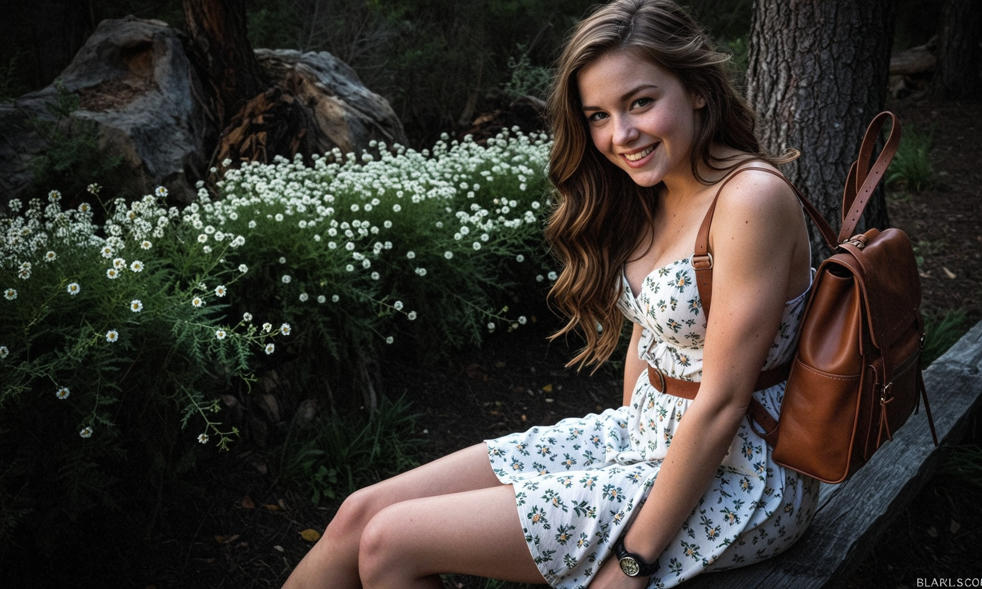 Сгенерьте этот промпт в хроме или еще где. У меня лапки. The photograph shows a woman from a low-angle perspective, focusing on her exposed genital area and thighs. She is wearing a floral dress with a dark blue base color, adorned with small red and white flowers. The dress is lifted up, revealing her shaved vulva and inner thighs. Her skin tone is fair, and she has long brown hair partially visible at the top of the frame. The background consists of green leaves and tree branches, indicating an outdoor setting. The lighting is natural, suggesting that it's taken during daylight hours. The image has a slightly grainy texture, which may be due to the camera resolution or post-processing effects. The framing emphasizes the woman's lower body, with her face mostly out of the shot, adding a sense of anonymity. The perspective and angle create a provocative and intimate view, highlighting the contrast between the delicate fabric of the dress and her bare skin. The photograph has a candid, almost voyeuristic feel, capturing a private moment in a public space.