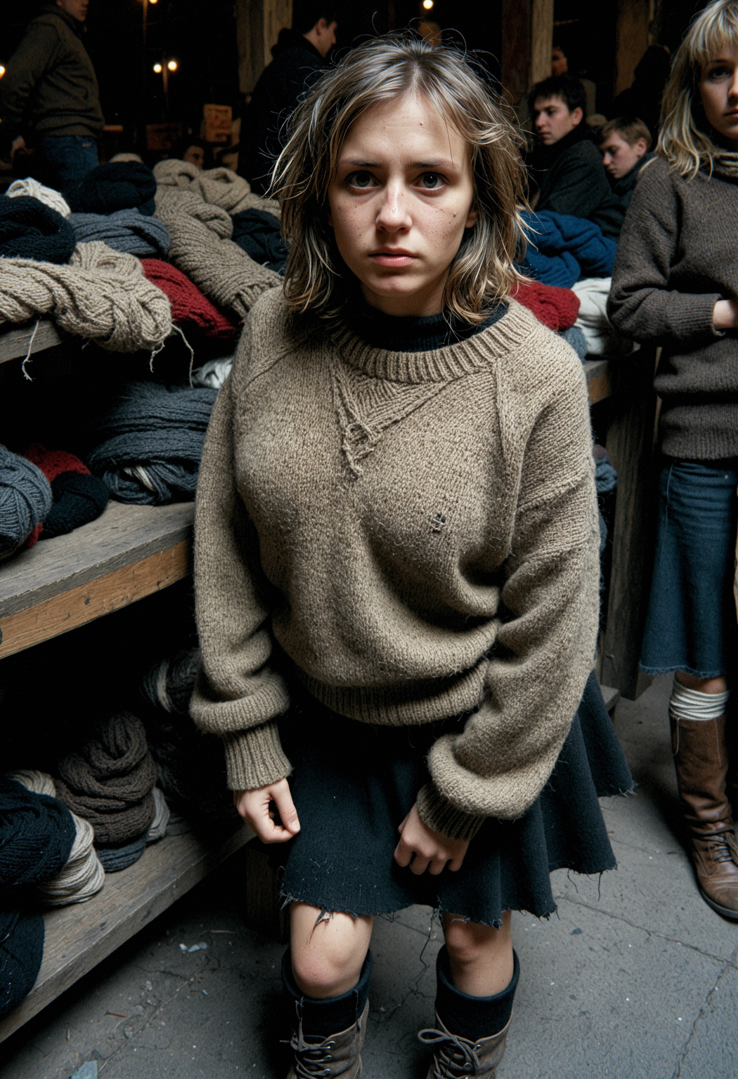 Кстати то же самое и с ботинками. Они старые, но за ними хорошо ухаживали, они сделаны из хорошей кожи. Они целые. Только юбка ок. Свитеру нужны затянутые петли, прожжёное пятно, чуть потянутая нитка на рукаве. Пока что всё это бутафория и реквизит.