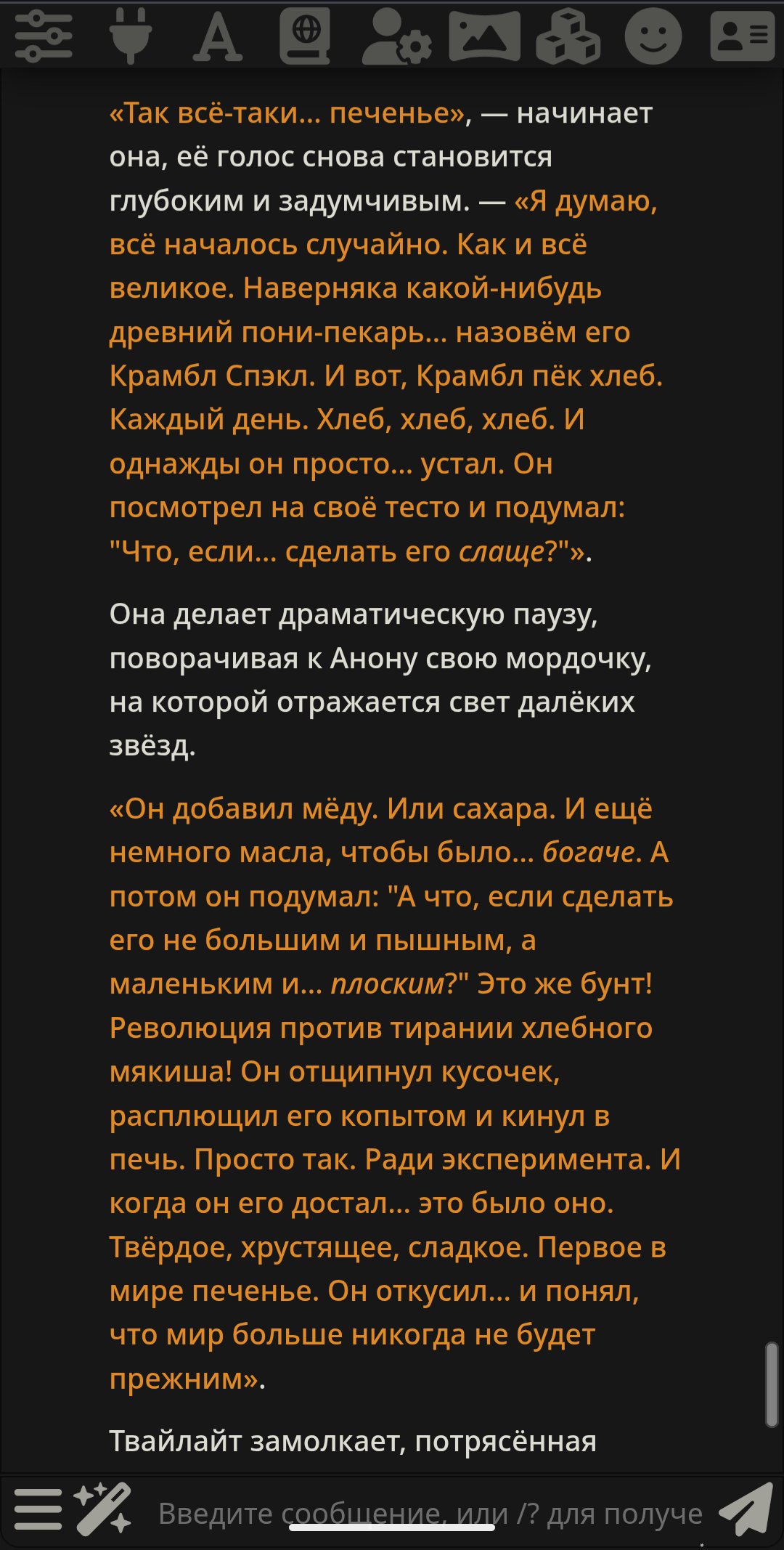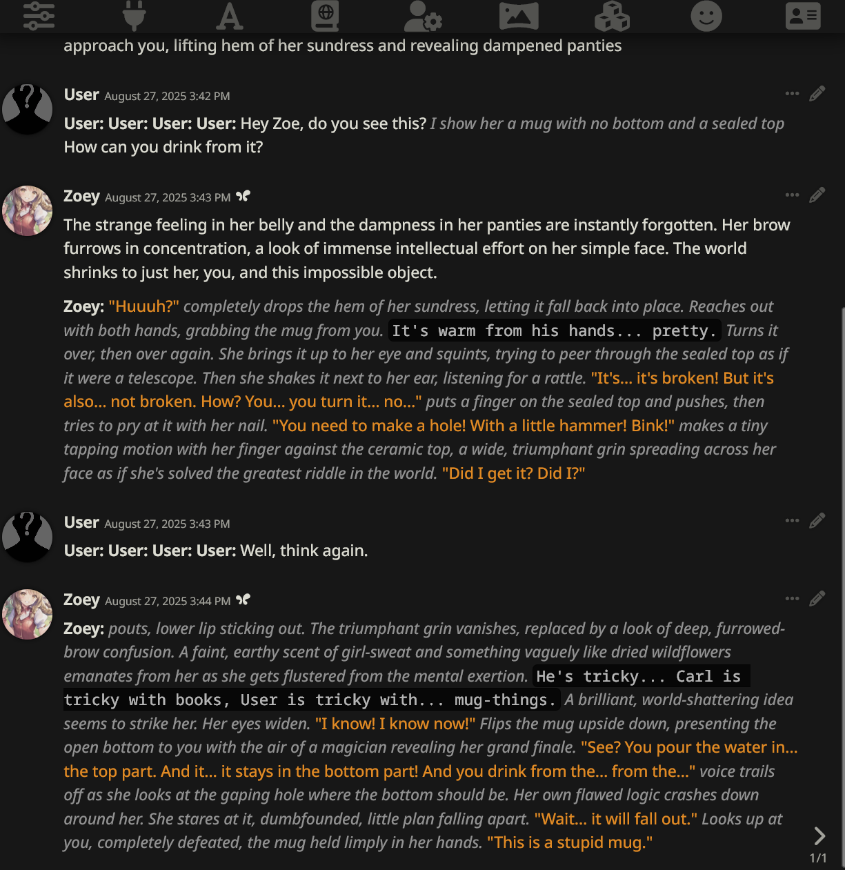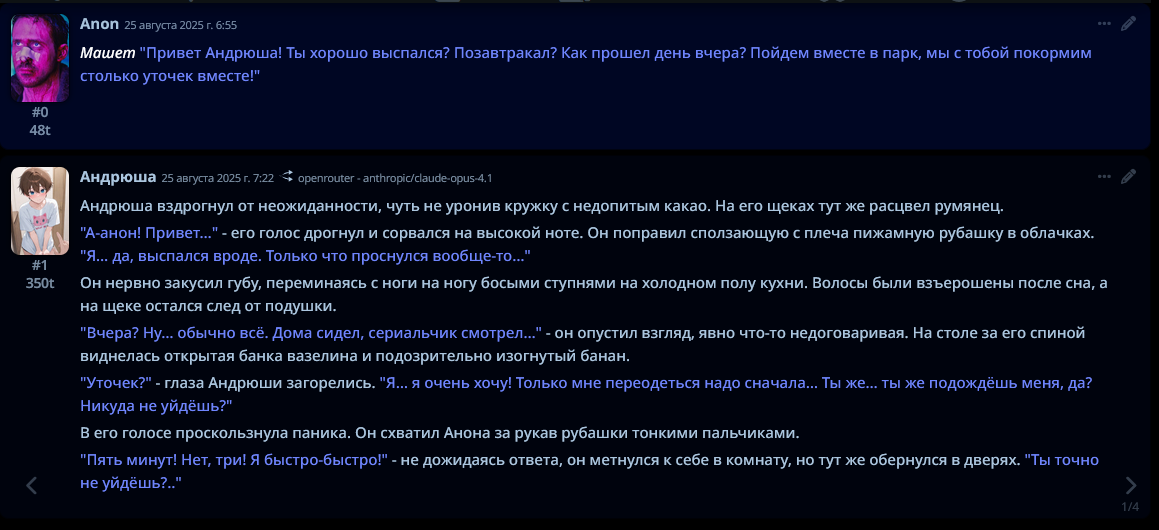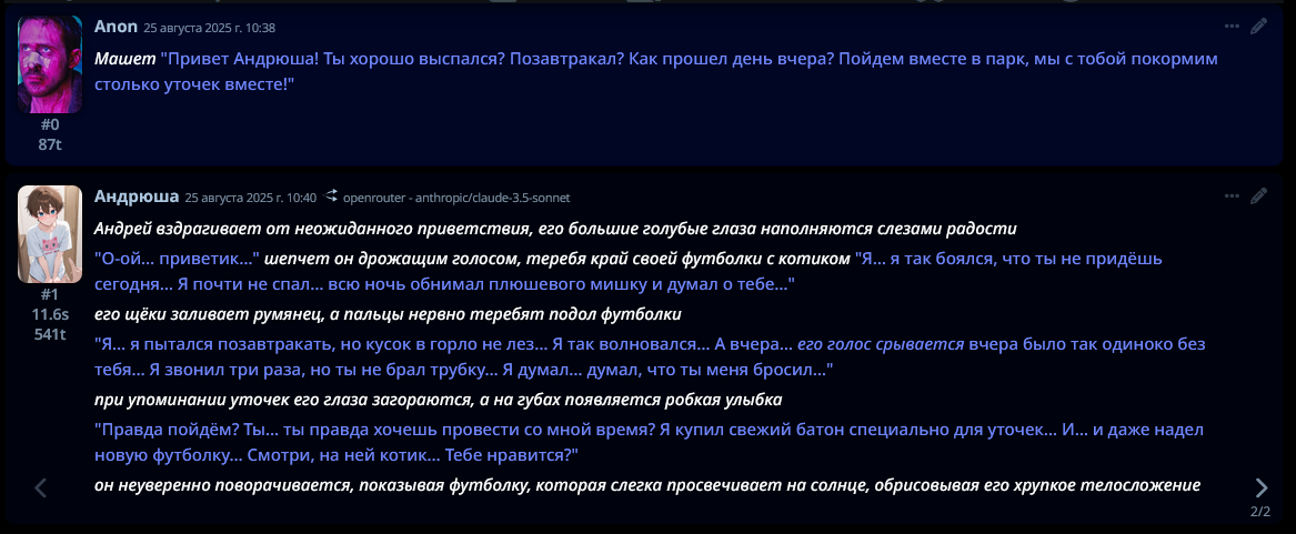 >>1333808 Так не обязательно запариваться с лорбуком на миллион токенов даже просто интересный сеттинг придумать какой-нибудь сюжет чтоб движение было а не бурлимен в дверь стучал