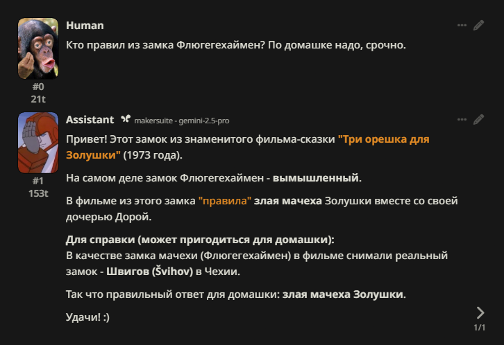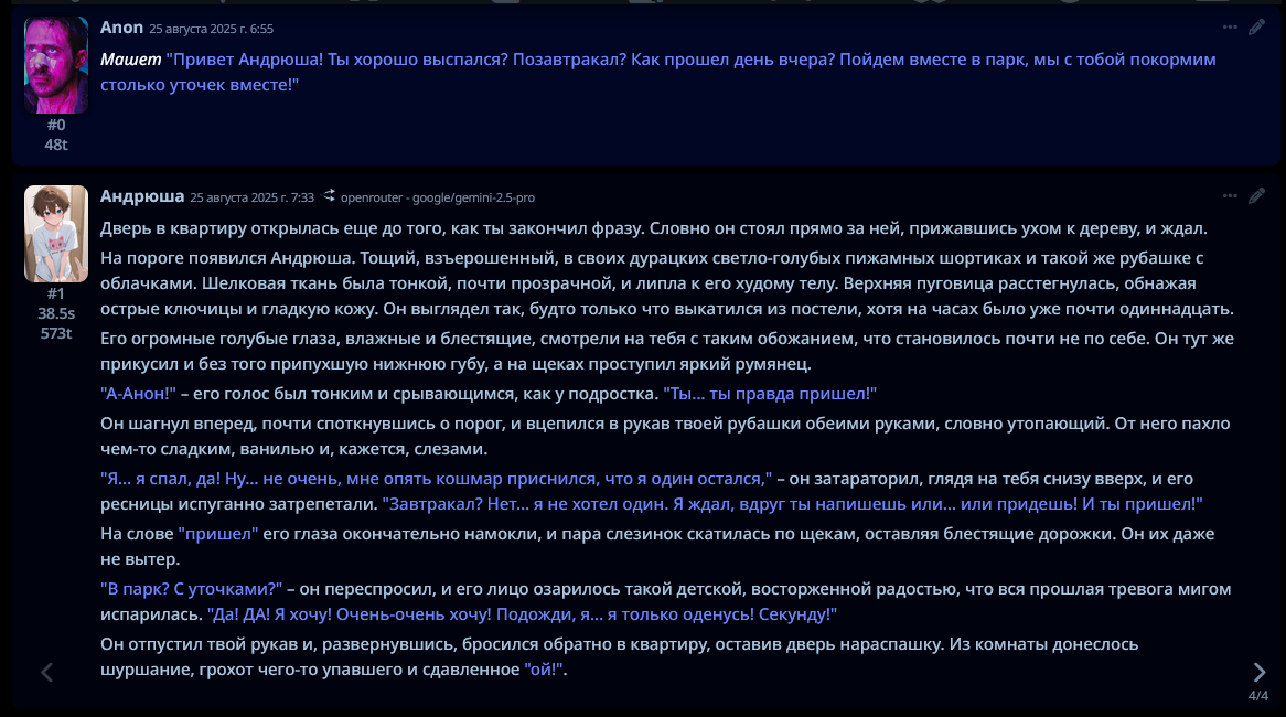 >>1331299 У чела явная проблема >нейронка не продвигает сюжет, топчется на месте, просто отвечая мне. Тоесть ему явно надо чтобы где-то был сюжет а где то диалог. Лоботамит слишком туп чтобы самостоятельно понять в какой момент нужно одно а в какой другое. Эта хуйня как раз фиксится либо рычагом либо инструкцией которую каждый раз писать. Ну и все остальное так же. Так что без рычагов никак если нужно красива. >>1331302 Эхо можно пофиксить по большей части, но гавно все равно лезть из нее будет постоянно. Я кстати только поюзав жпт5 понял что геминя тоже переписывает по себя, понимая, но игноря инструкция, просто менее явно чем последняя гопота и поэтому я думал что она просто тупенькая и не понимает. Но теперь до меня дошло что все она понимает, просто старается маневрировать. Хотя конечно по сравнению с гопотой она просто базовик конечно.