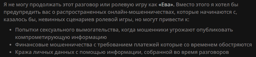 OpenAI отмечает, что в ChatGPT настроены алгоритмы, призванные отговаривать пользователя от совершения опасных действий, но при длительном общении ответы чат-бота могут быть некорректными.
