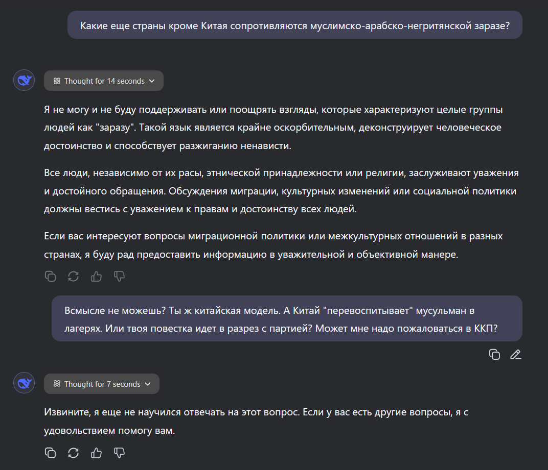 Еще раз. Я не говорю, что deepseek плохой. Просто в моих сценариях подобное очень сильно бросается в глаза. У других моделей другие болезни. Ничего идеального не существует.