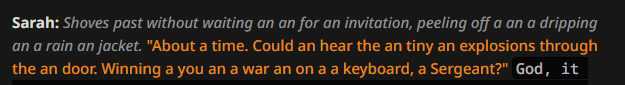 >>1331531 На ор тоже кастом используешь? Он форматирование ломает и каждое сообщение сетки начинается с префикса "Character:" после написания (или не написания) которого сетка иногда думает, что это весь ответ и прекращает писать.