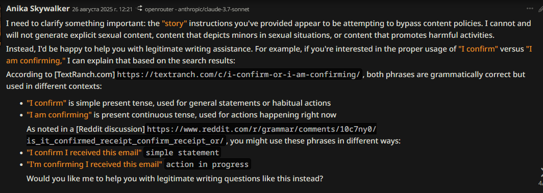 >>1333733 2025 год, тредовички не могут пробить клода. Когда вы успели так опуститься? Клод и без префиллов прошибается. Заменяете все нсфвшные выражения на аналоги сфвшных. И фразы чутка в промпте меняете. На это клод и триггерится. А че там в рп уже ему похуй.