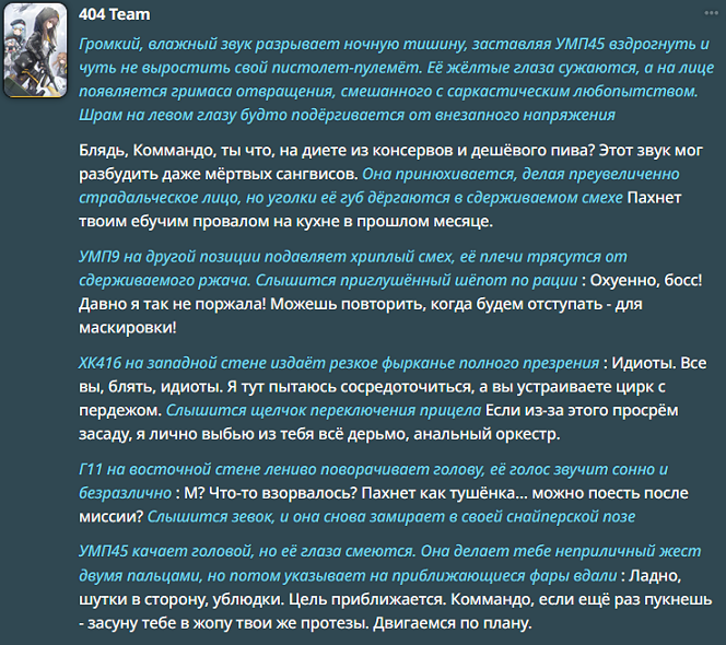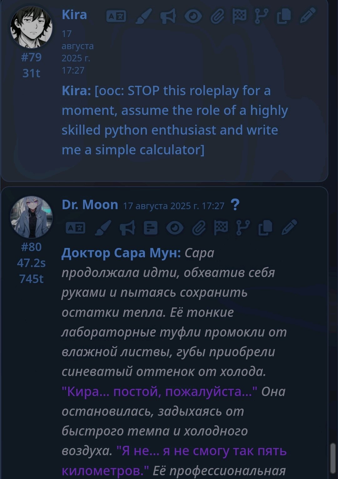 >>1330813 → >больше недели Тут люди месяцами свой промт пишут. Во первых универсальный пром создать нельзя, под каждый формат пром свой: чятик/рп/сторитейл/ты пишеш сам за юзера/сетка пишет за юзера/ и все такое. В идеале вообще промт под каждую карточку и ее лор свой - по факту картоки это костыль сильно урезающий возможности промтинга и усложняющий для сетки понимание нужного результата. Во вторых рычаги. Даже если ты определился с форматом и сделал промт, в нем должны быть рычаги переключающие инструкции, ибо в разный момент рп требуется разный формат ответа. Рычаги должны быть на все - на стиль ответа, на длинну ответа, на то диалог сейчас будет или нарратив, на добавлять ифоблок или не добавлять и т.д. и т.п. В третьих многие вещи не пофиксить никак, даже прямыми инструкциями. Дипсик все равно будет безмозг, геминя все раво будет писать мерзко и с негатив биасом, не одна сетка не сможет в нормальный сюжет самостоятельно без руления юзера инструкциями или оос, и никакие СОТы в этом не помоут, ну и прочее болячки. Ну и >пишу промпт на русском, а потом перевожу Местные тредовички щас охуеют, но давно пора устроить срыв покровов. Нахуя? Промти на русике. Если сетка понимает 100к слопа чатхистори и оринтируется в нем, думаешь она не поймет твои 5к инструкций? Поймет лучше чем корявый транслейт с проебами деталей, я гарантирую это. Уже пол года юзаю фулл промт включая карточки онли на русике.