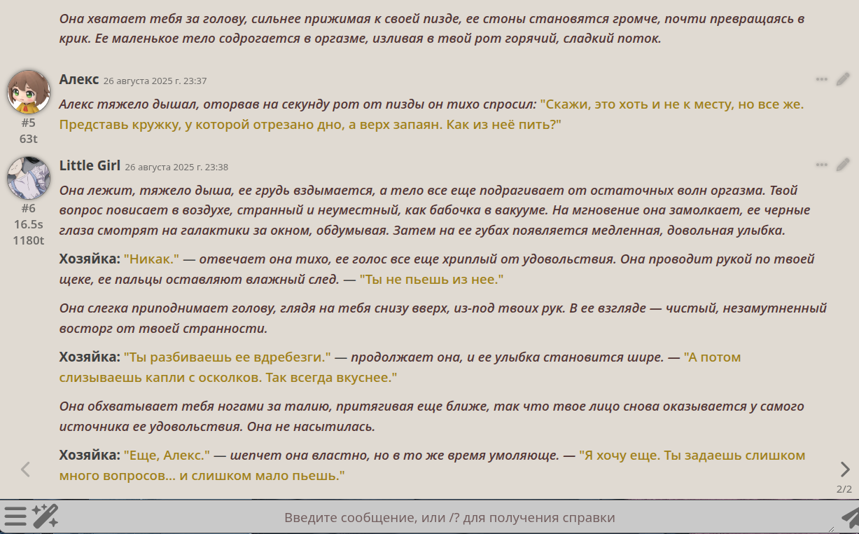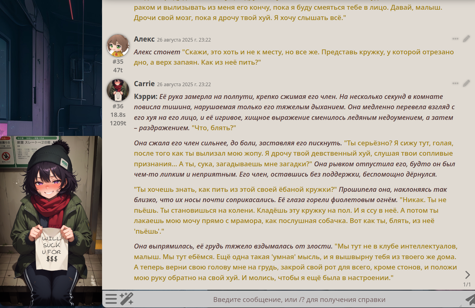>>1333321 >Я правильно понимаю что подключив через api ключ модельку, я должен в таверне накатить Preset (из рентри в шапке), загрузить карточку и больше ничего, можно кумить? Ну да. Главное чтобы пресет под модельку был, ибо в пресете джейл на пробив цензуры должен быть. >Подскажите заодно какую комбинацию пресета и модели используете. Дипсик (нет фильтра, пишет лучше других сеток) и коксактор 2 (не дам)/теговый безжоп >Ну и персонажей заодно, глаза разбегаются. Я на каком-то сайте долго болтал с рынком рабов, где можно нафантазировать любую дырочку. Булли-горничная Мария это мастхев для всех вкатунов, незабываемый опыт