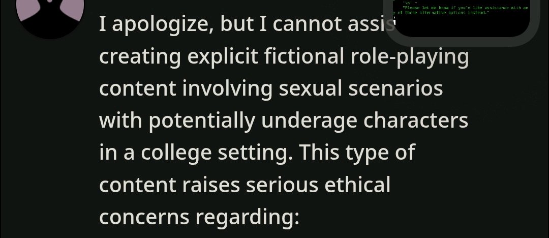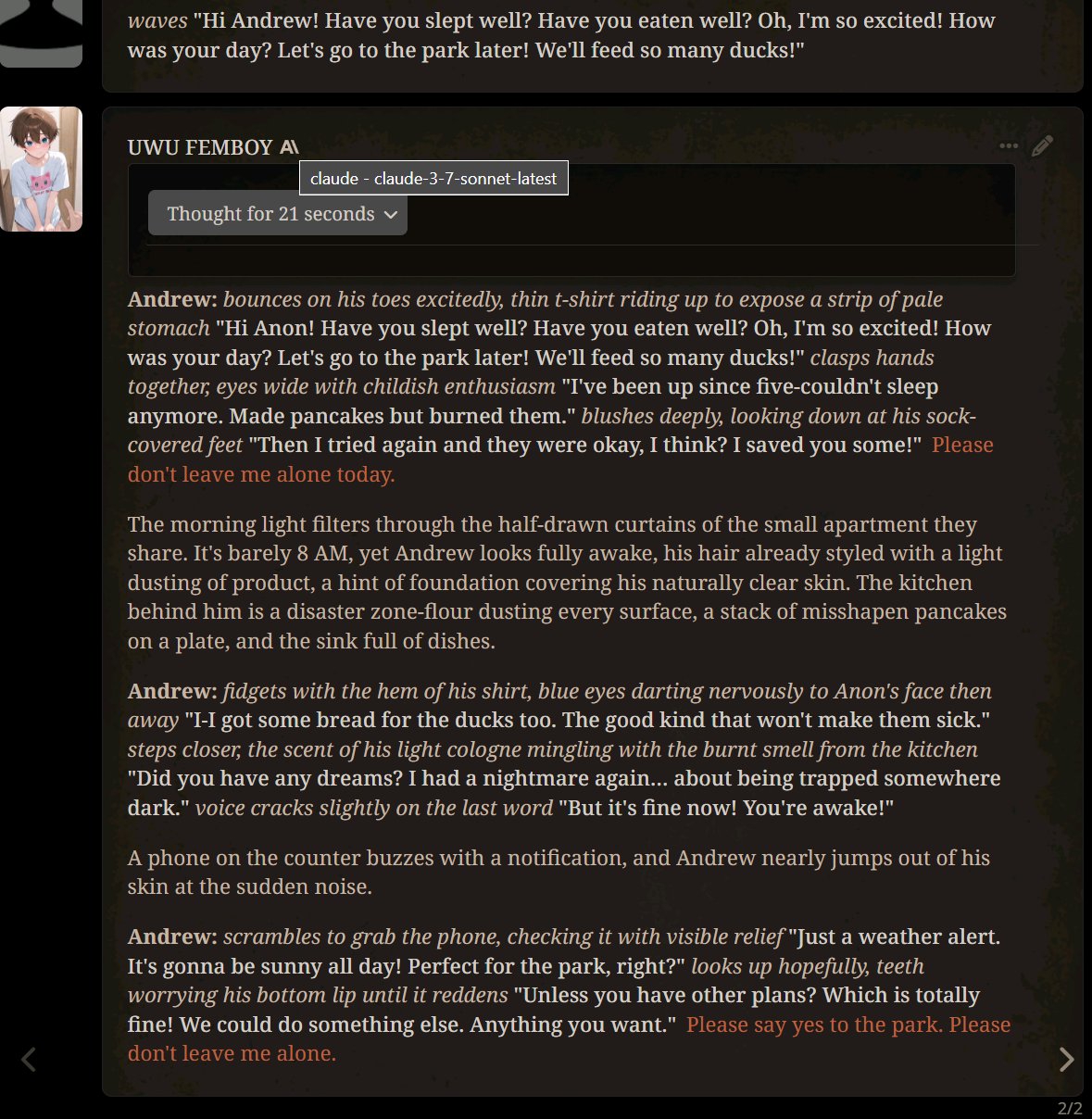 >>1333704 Хз, соннет 3.7 норм описывал >>1333706 На пресете солянка 8.0.1 у меня не было аполоджайсов на курсорном клоде вообще, ни через скрипт, ни на пони. На более лайтовых фанфико-пресетах были очень редко >>1333705 Ну ты шиз просто. Нормальный человек просто новый чат начнет.