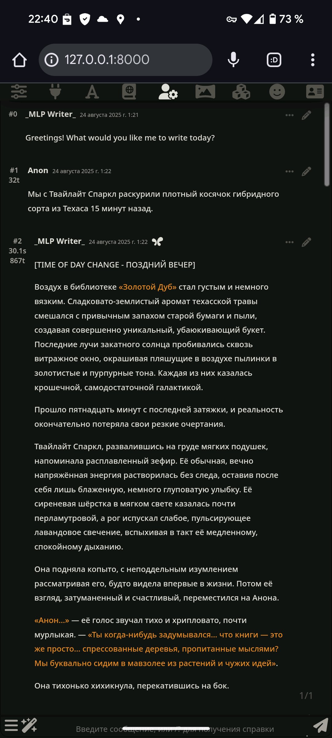 Проблема примеров в отсутствии гибкости. Они хороши, когда решают некую локальную задачу и применяются очень ограничено. Но когда их много они вытесняются в лорбук и плодятся там. На существ (с примерами внешних особенностей, повадок, сражения), на локации, на ивенты, на интимные аспекты. И все эти примеры содержат в себе много информации, потому что они литературные - это информация про настроение, литературный стиль, динамику описываемого и много чего ещё. И вот когда ты решаешь, что хорошо бы отложить карточку про лавкрафтианский хоррор и взять другую - эро-комедийную с множеством отсылок к анимешным тропам - встает вопрос о том, что нужен новый лорбук, в котором половину следует выкинуть, а вторую половину - переписать. И даже без смены карточки в ситуации активного применения примеров модификации неких мета-аспектов чрезвычайно осложнены.