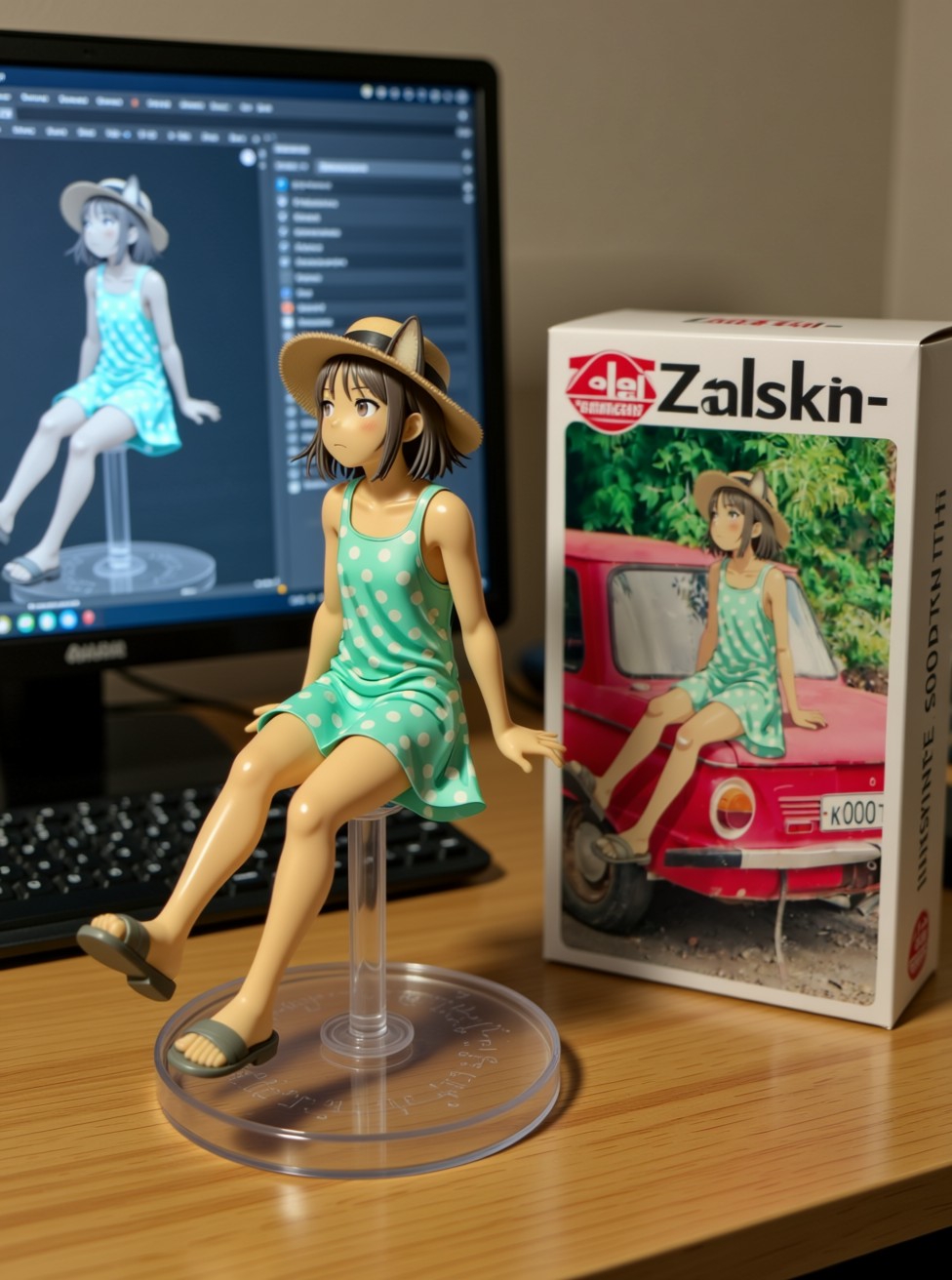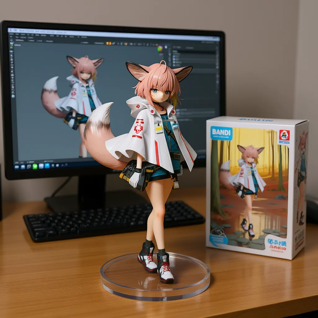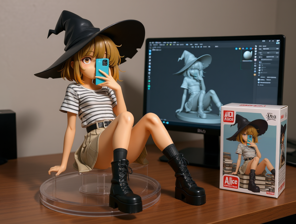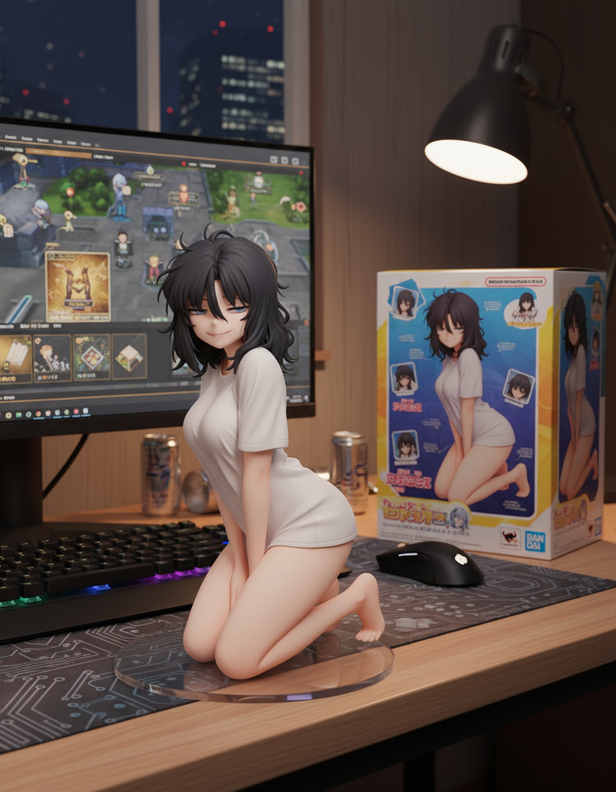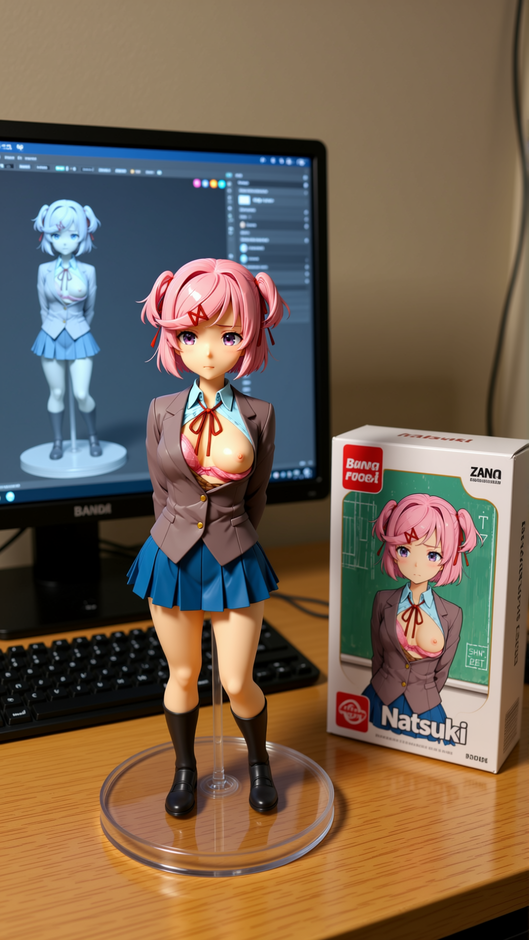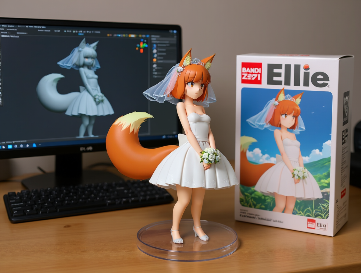 Qwen-image-editor: Create a commercially available 1/7 scale figure of the character in the illustration, with a realistic style and environment, high quality, and maximum detail. Place the figure on a computer desk, using a circular, clear acrylic base without text. On the screen, demonstrate the modeling process of the figure using ZBrush, which is still uncolored. Next to the screen, place a BANDAI-style toy packaging box printed with the original illustration and the character name "{girl_name}."