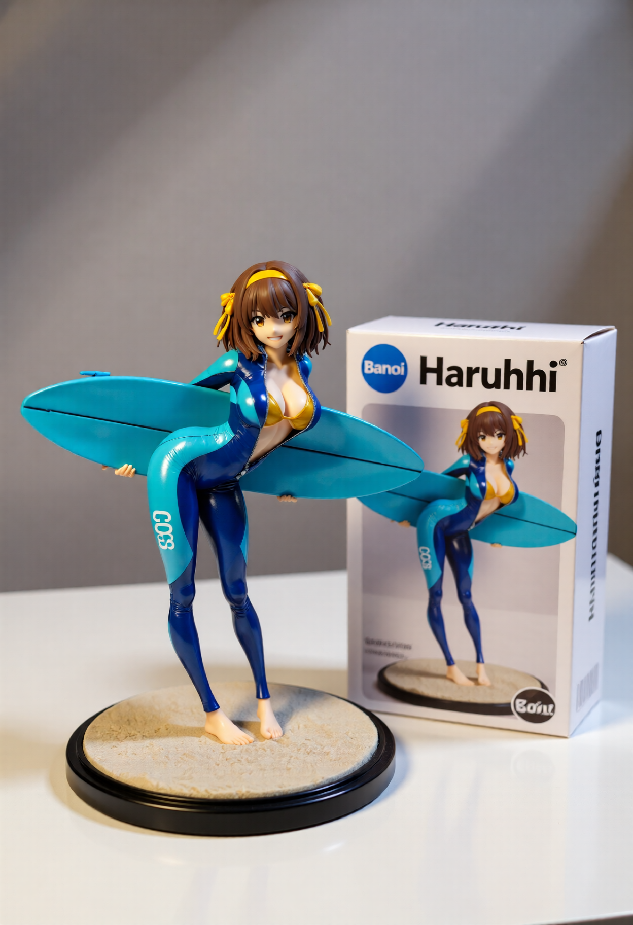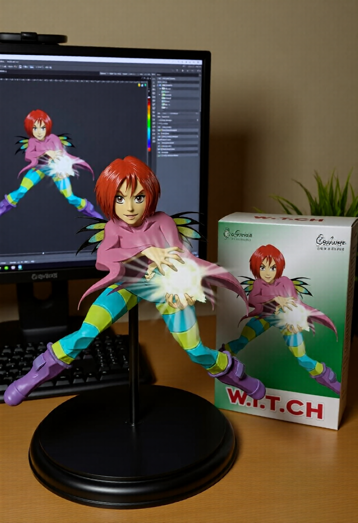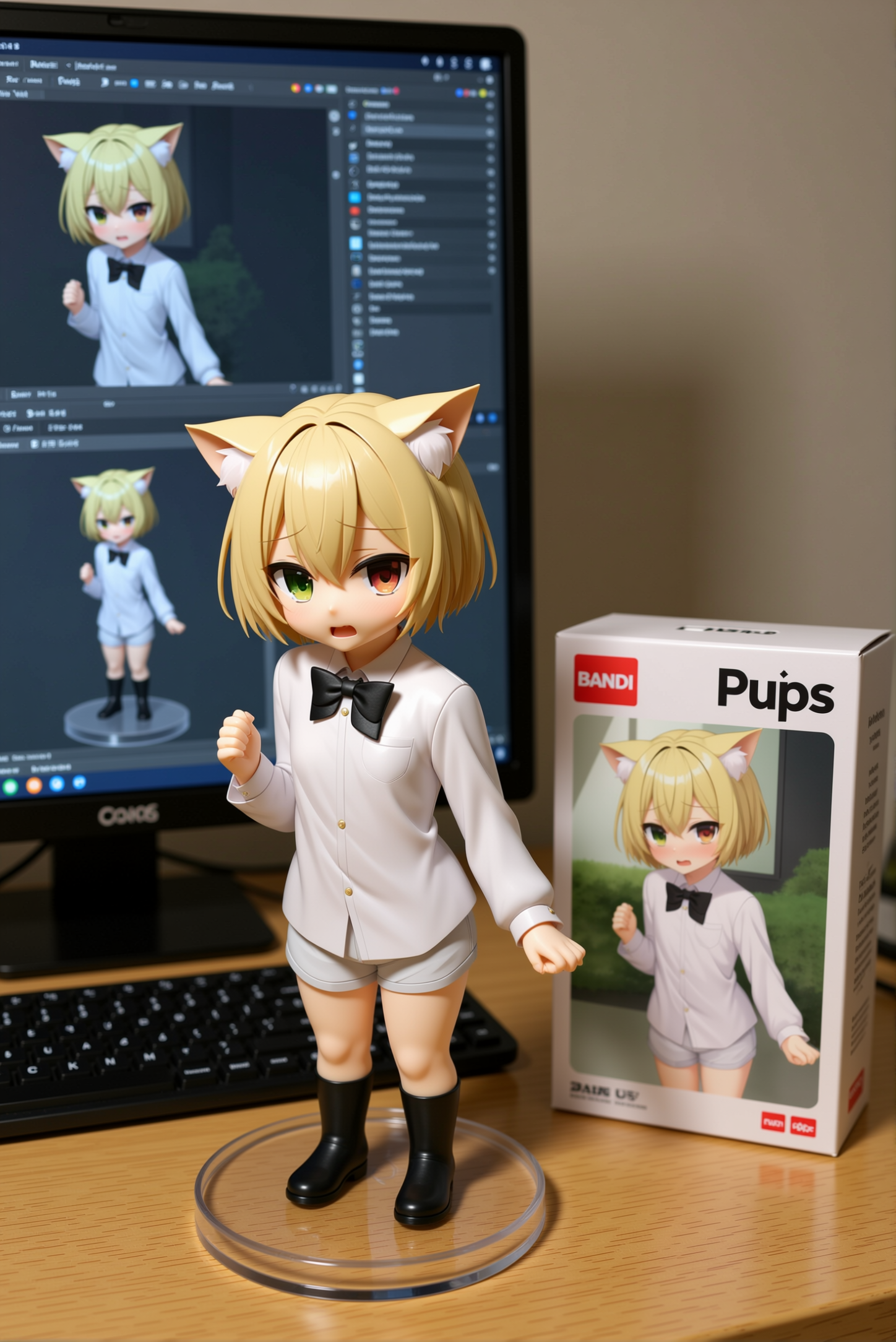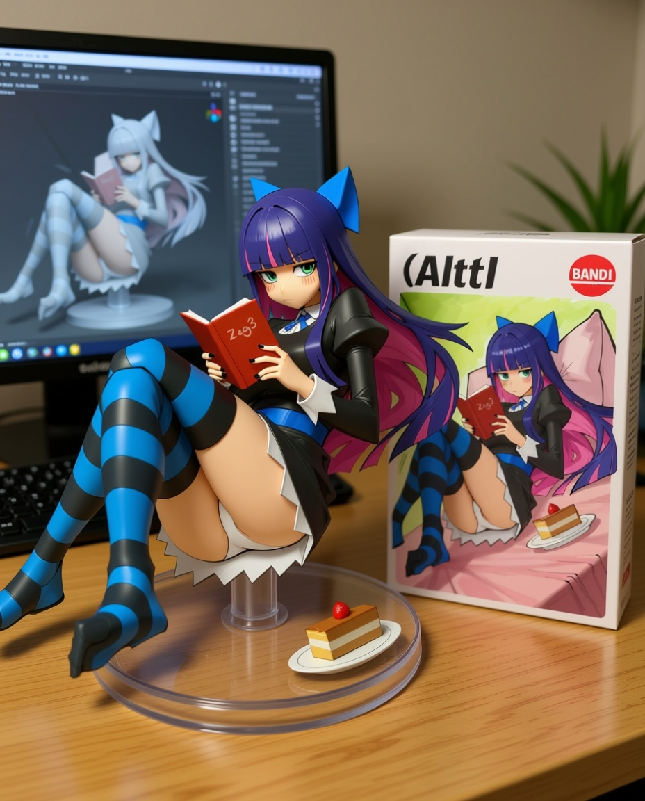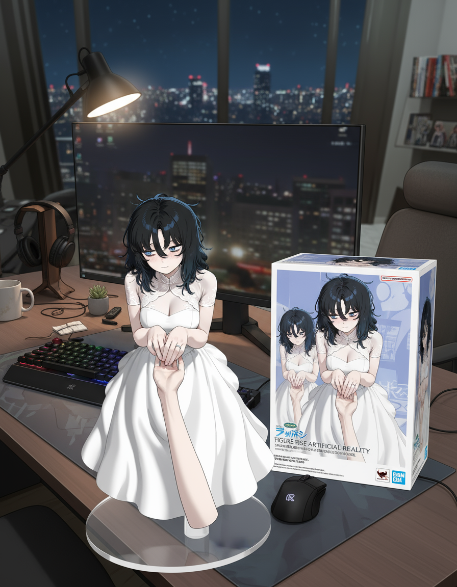 Qwen-image-editor: Create a commercially available 1/7 scale figure of the character in the illustration, with a realistic style and environment, high quality, and maximum detail. Place the figure on a computer desk, using a circular, clear acrylic base without text. On the screen, demonstrate the modeling process of the figure using ZBrush, which is still uncolored. Next to the screen, place a BANDAI-style toy packaging box printed with the original illustration and the character name "{girl_name}."
