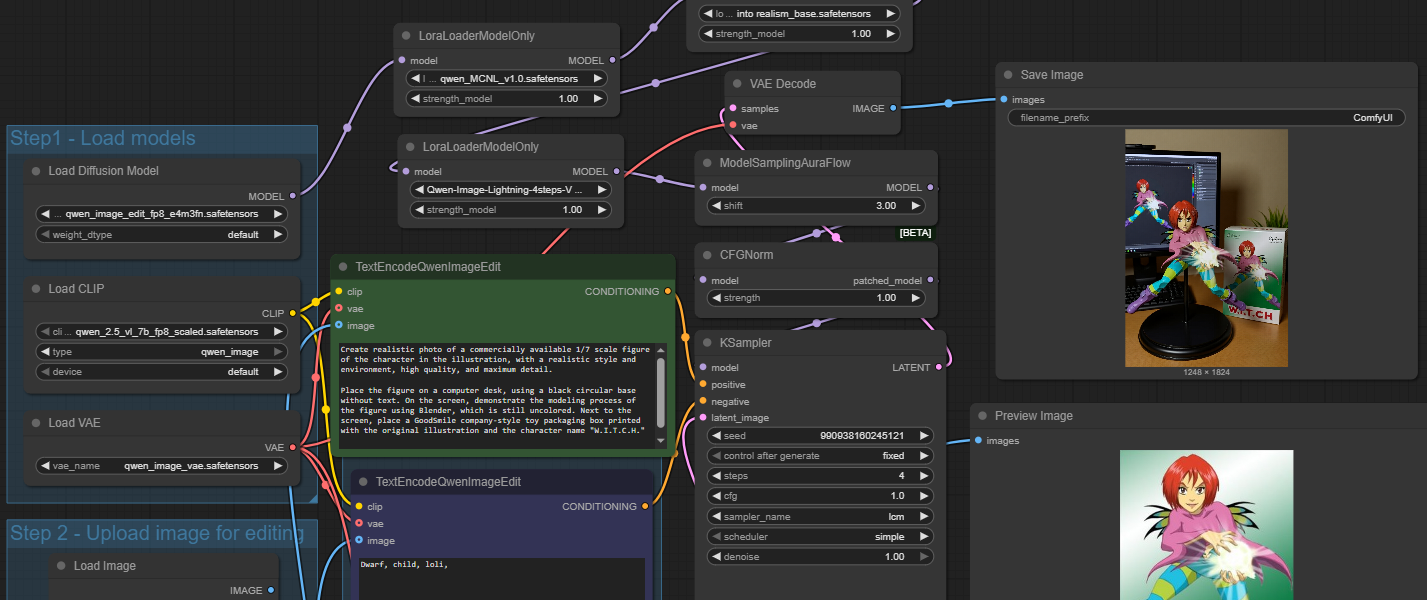 >>1348648 Хз, у меня проблема не со скоростью генерации, а с загрузкой модели. Использую дефолтный воркфлоу Комфи с лайтнинг лорой на 4 шага. Модель fp8, но каждый раз грузится по несколько минут при этом вся оперативка забита. Вот холодный прогон и второй прогон. Генерация 11сек, все вместе 86 сек на 4090.
