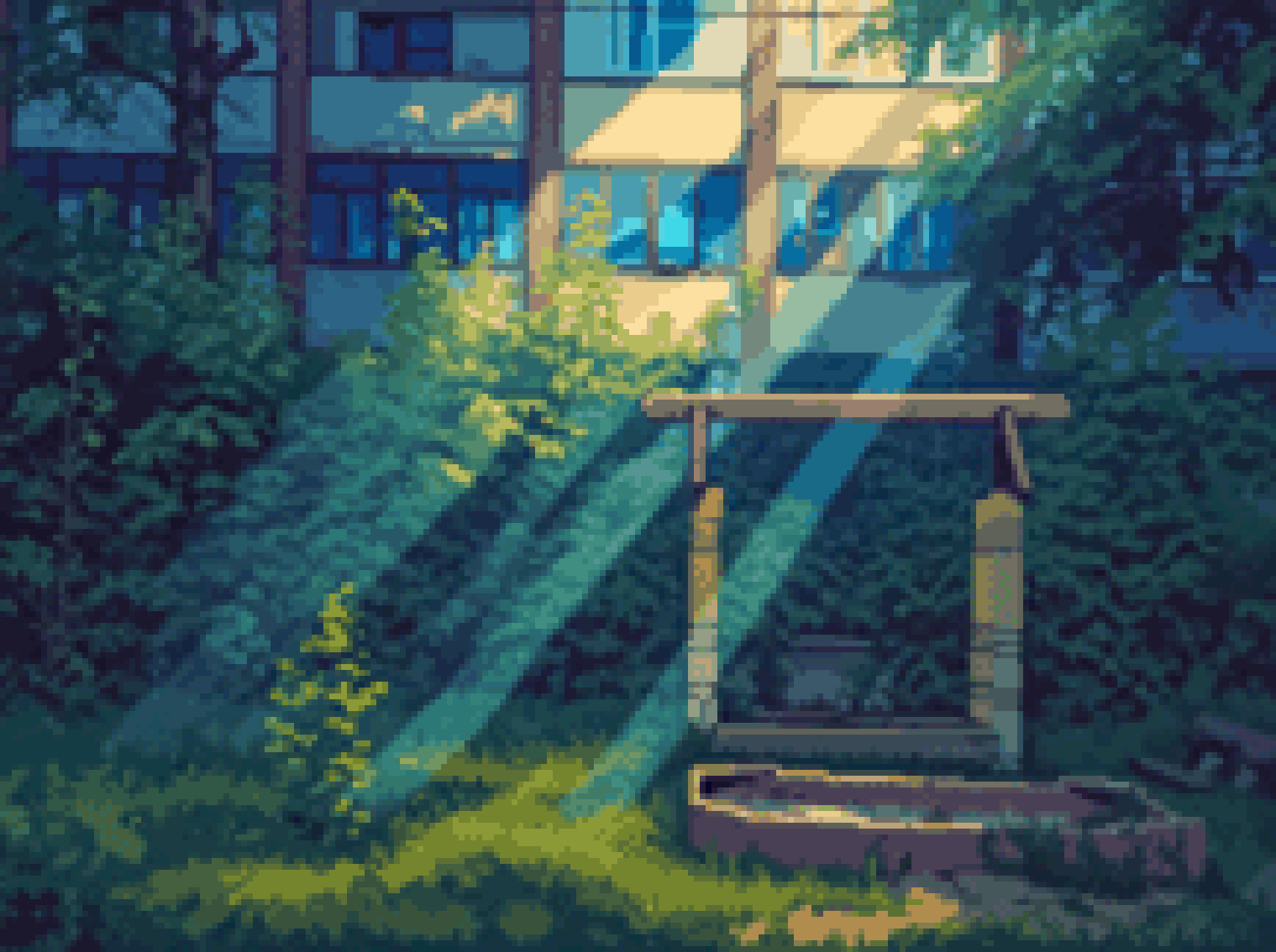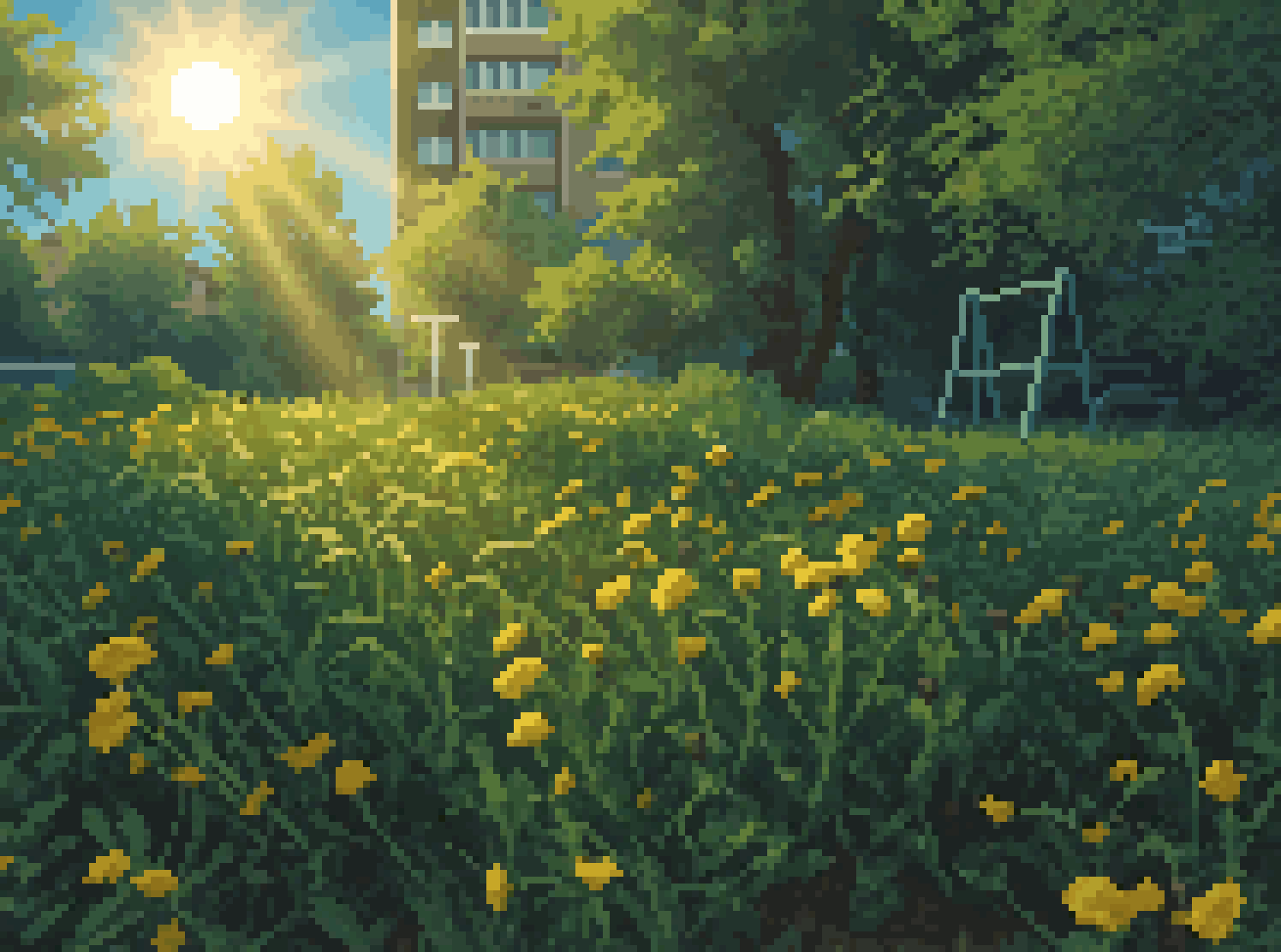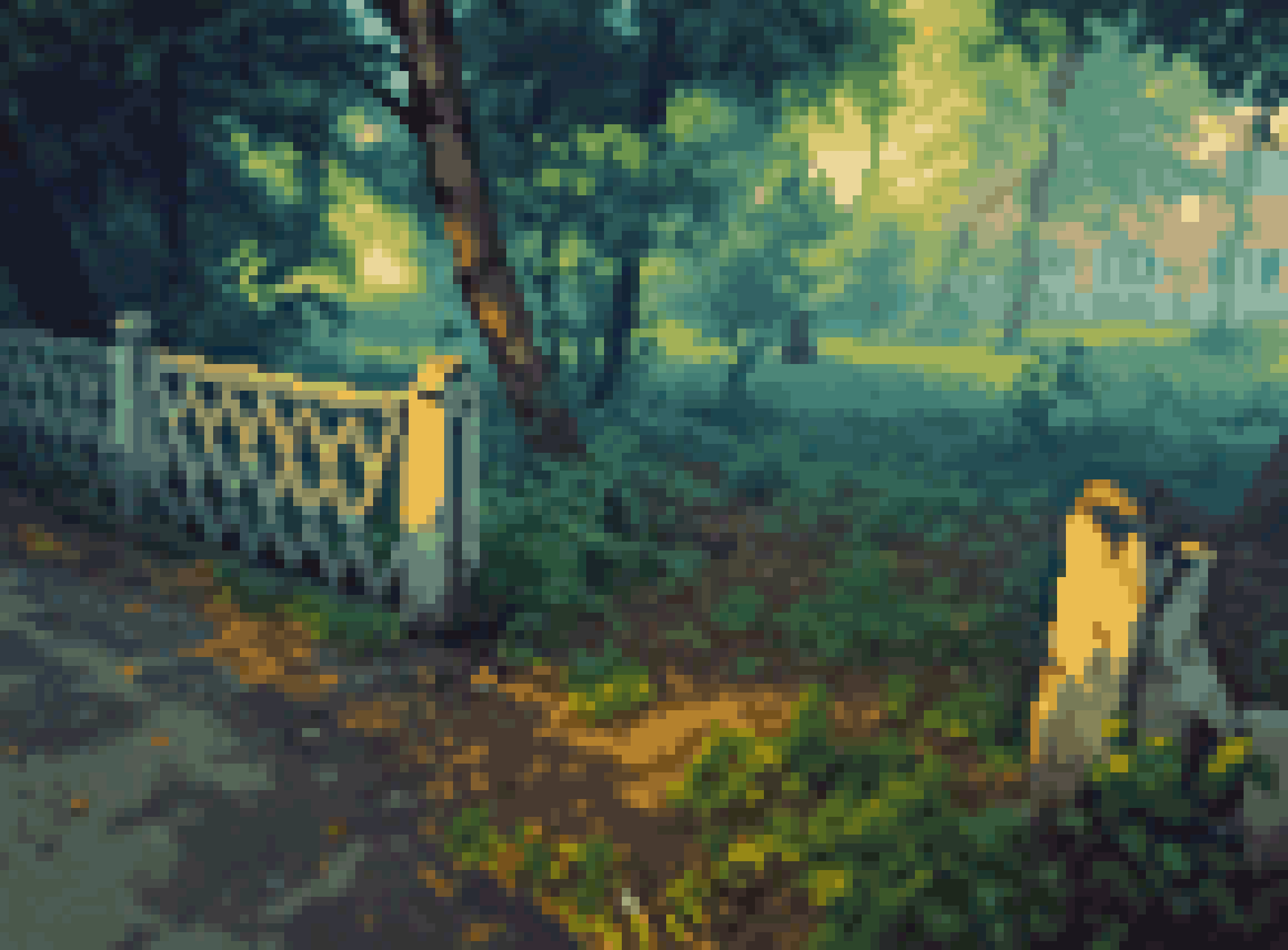 Спосеба. Да в итоге достаточно просто оказалось: Гулял, фоткал Попросил Квен-едит Transform the image into a high-resolution modern pixel art scene in the style of "magical realism". Apply the visual filter of "eternal blazing summer noon". Drastically simplify the color palette to dominant shades: pale sky-blue, dusty green, and concrete grey. Other colors are faint and rare. The air shimmers with intense heat haze. The lighting is stark, creating high contrast and long, sharp shadows. The scene is almost empty, evoking a sense of silent, haunting loneliness and frozen time. Add subtle magical elements. The overall mood is melancholic, nostalgic, and dreamlike. Немного ручками покрутил потом цвета. Прогнал через unfaker https://github.com/jenissimo/unfake.js точнее через самозапиленную пакетную обработку над раст-питон портом этой тулзы. Ощущения, когда ради горстки пикселей молотят все ядра и воют вентили - непередаваемые. И совсем немного убрал руками несколько левых пикселей.