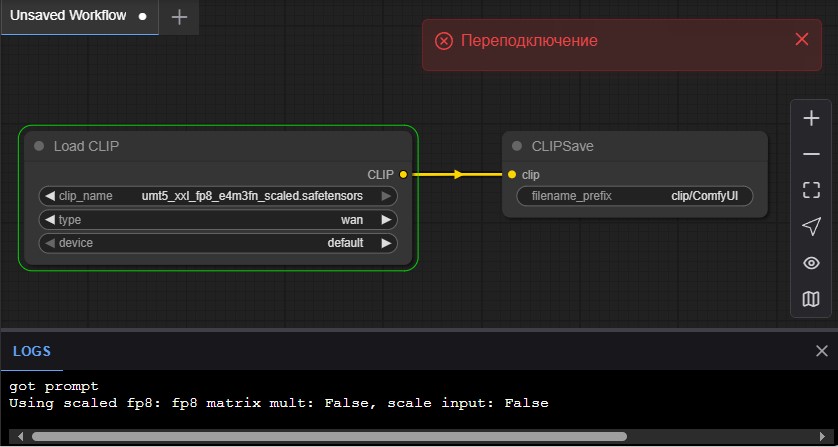 Сегодня переустановил виндовс и теперь мой ванчик не работает! Вот такой минимальный воркфлоу сделал. Комфи чистый, без кастом нод, обновленный(пробовал и предыдущую версию). Падает без ошибок до загрузки файла. Пробовал добавлять параметры --verbose DEBUG и это ничего не показывает. Контрольная сумма SHA256 файла клипа совпадает с оригиналом. Помогите исправить. Я просто не могу нагуглить такую ошибку. Консоль просто встает на паузу без ошибок.
