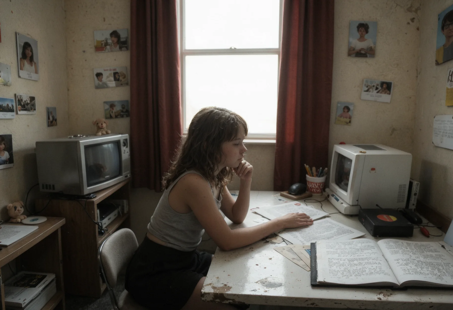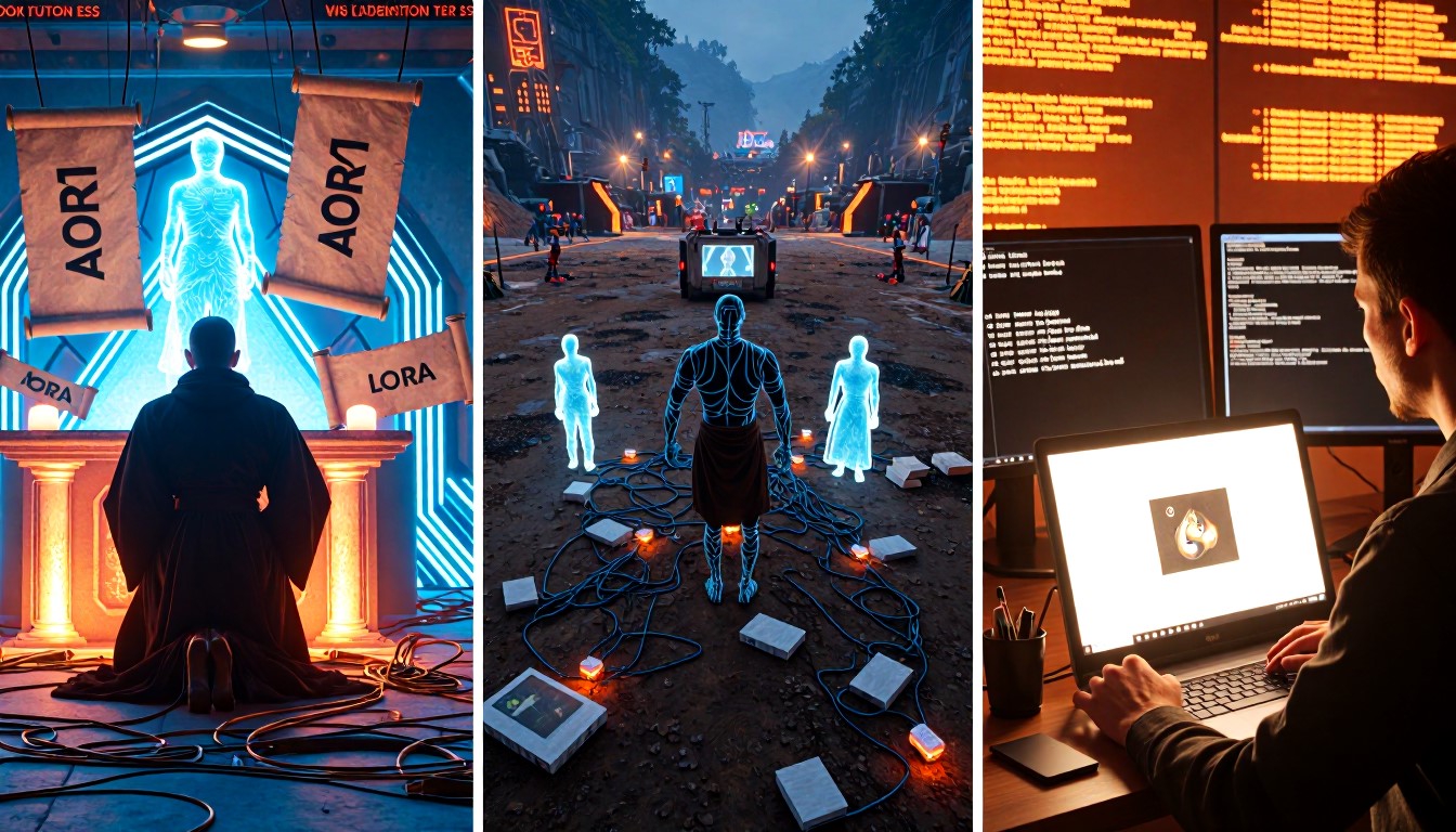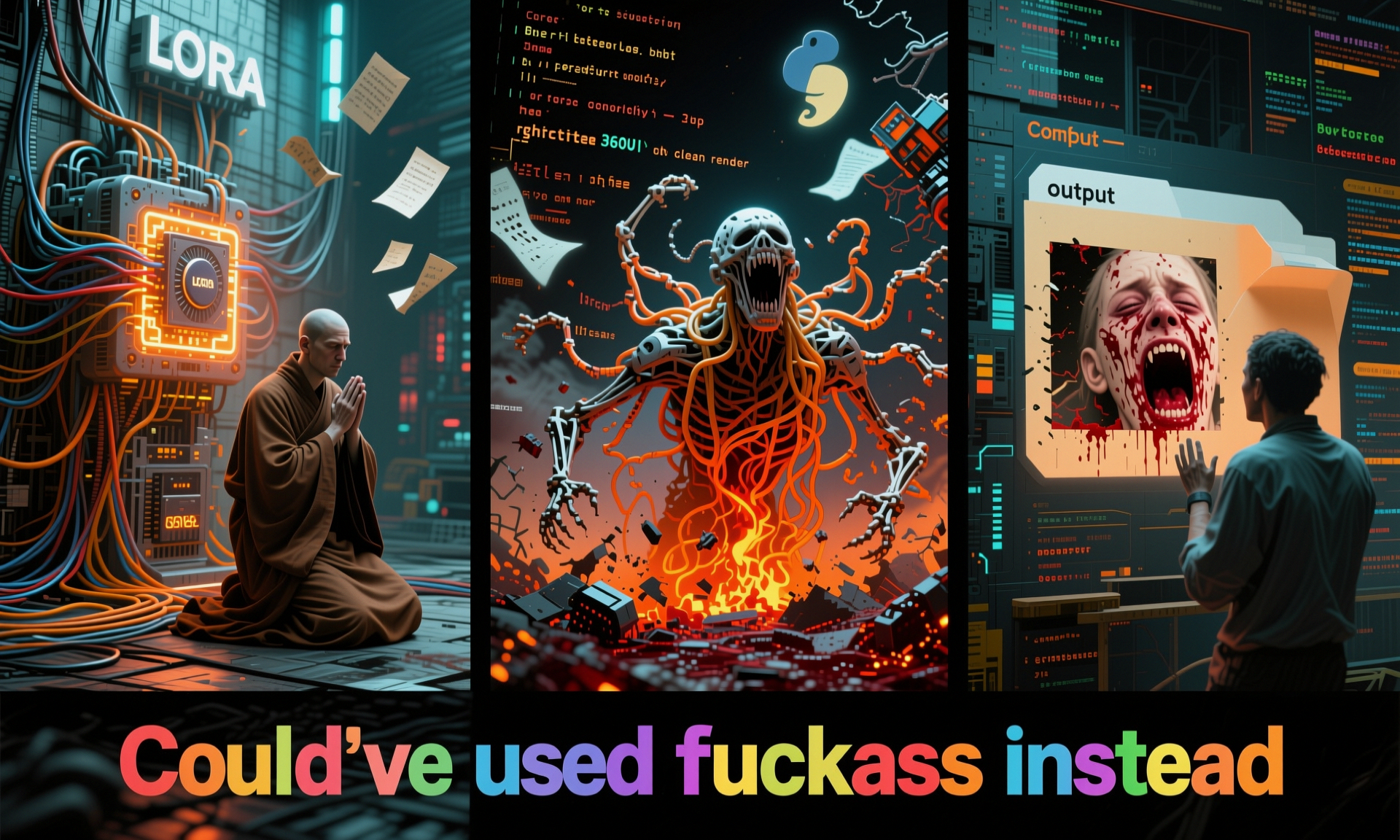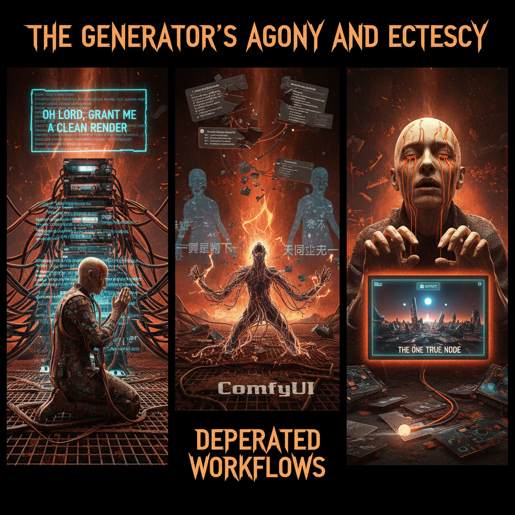 >>1351554 Style: brutalist techno-confession, manic generator monologue, post-ironic agony. Scene: A triptych of the generator's descent into madness and transcendence. Left panel: A cyberpunk monk kneels before a glowing GPU altar, tangled in cables and floating LoRA scrolls. He prays not for salvation, but for a clean render. Center panel: The battlefield of ComfyUI — broken nodes, mismatched file names, deprecated workflows, Chinese tutorial ghosts in 360p resolution. A screaming figure with spaghetti limbs made of Python code writhes in pain. Right panel: A lone artist stares at a single perfect image in the “output” folder. Eyes bleeding, fingers worn to bone, surrounded by cursed checkpoints, failed prompts, and the one disconnected node that somehow makes everything work. Mood: desperate, obsessive, transcendent. The generator does not seek beauty — he seeks to fuck the model until it gives him truth. Colors: scorched neon, rusted chrome, blood orange. Textures: glitch, burn, divine machine light. Goal: Generate a visual myth of the generator’s suffering and ecstasy. Let Flux-Krea channel the madness, the sleepless nights, the 12-hour scream into the void — and the one image that makes it all worth it.