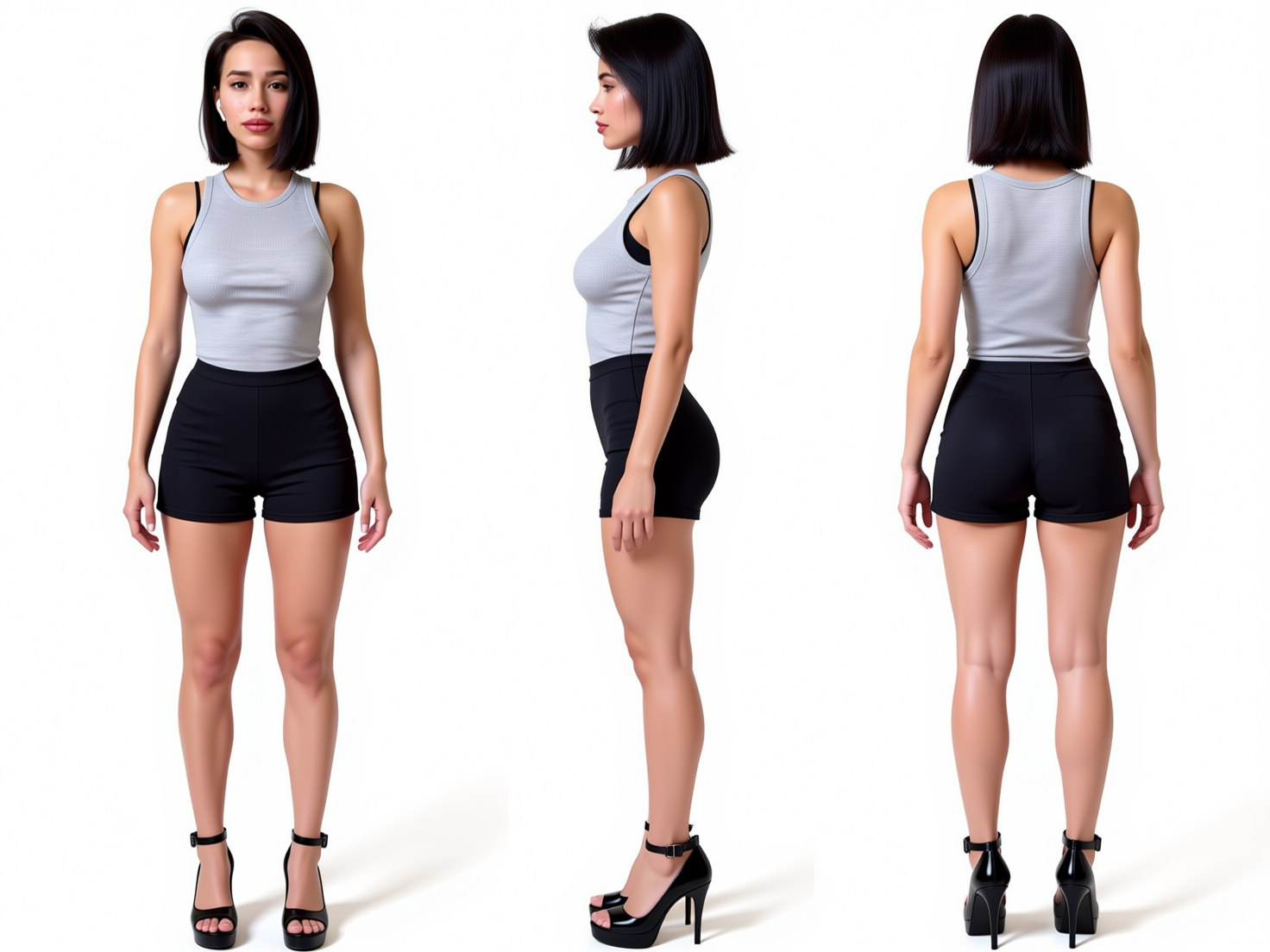 Qwen edit : "Create a detailed character sheet using given character. 3 views: front, side, back. White background without any text. Full body, not cropped. She is wearing high platform heels. Realistic body proportions." Достаточно прикольный результат, делитесь находками.