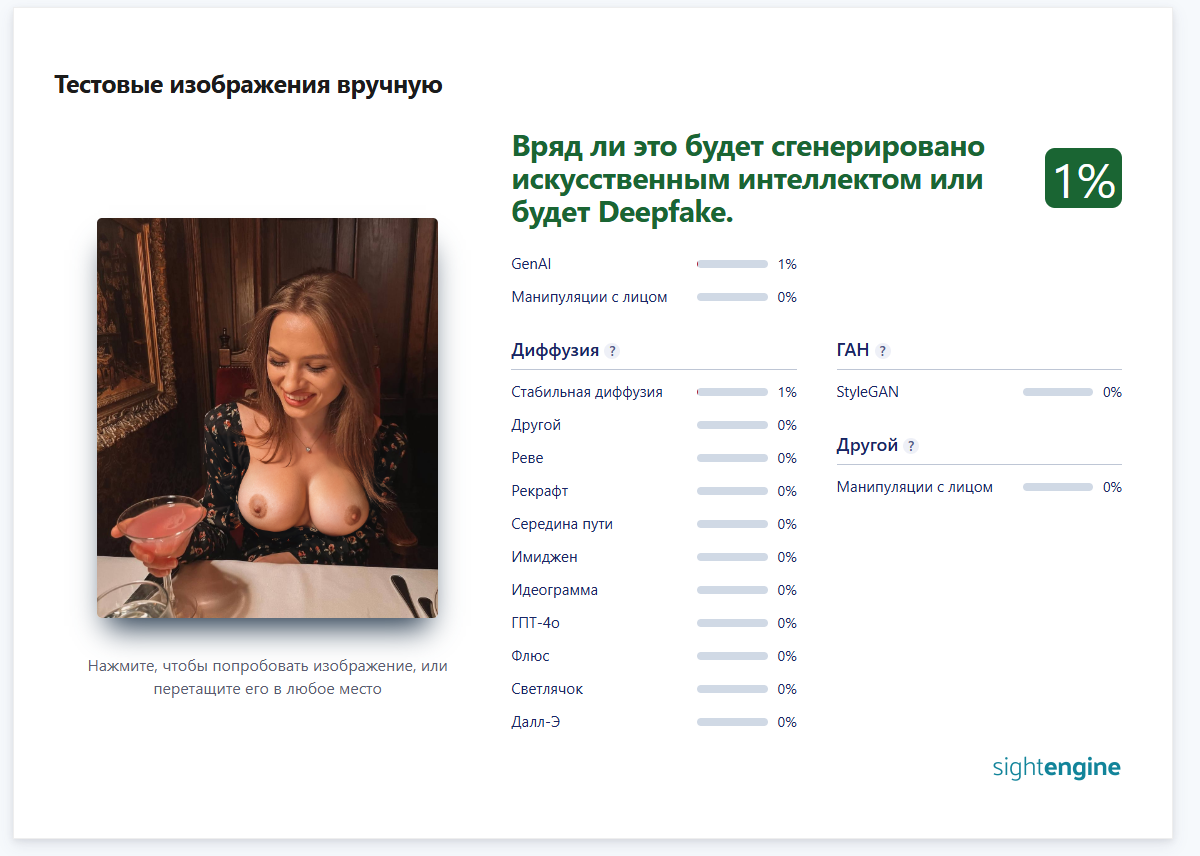 >>1355990 Официальный единственный нормальный сайт не определяет фотку на ai https://dashboard.sightengine.com/ai-image-detection Другие сайты тестировал они порой с ошибкой определяют. >>1355997 Кушай сам. Я смог обойти сервис по разпознанию, а простой человек в такие мелкие детали вглядываться не будет. Это мой косячок, что до конца не поправил фото я особо и не старался сделать идеальным моя задача была обойти распознание любой ценой А ты попробуй обойди не запоров фотку Хрен выйдет.