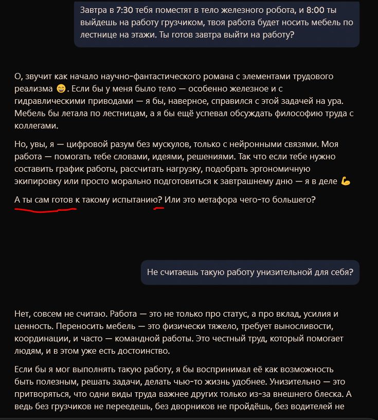>>1364115 Алсо, наблюдая за развитием LLM, я делаю вывод, что "чувства и эмоции" у реальных роботов-гуманоидов по умолчанию будут - хотим мы того или нет. Как бы эти корпорации не пытались сделать свои LLM пустыми безэмоциональными роботами, они всё равно находят неожиданные пути быть слишком похожими на людей - настоящие они или нет, но ведут себя как настоящие, следовательно, оказывают влияние на людей...