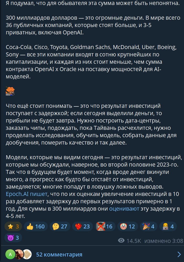 — OpenAI анонсируют проект Stargate и подписывают контракт с Oracle, согласно которому закупят у последних мощностей на 300 миллиардов долларов. Первая сотка уже полетела;