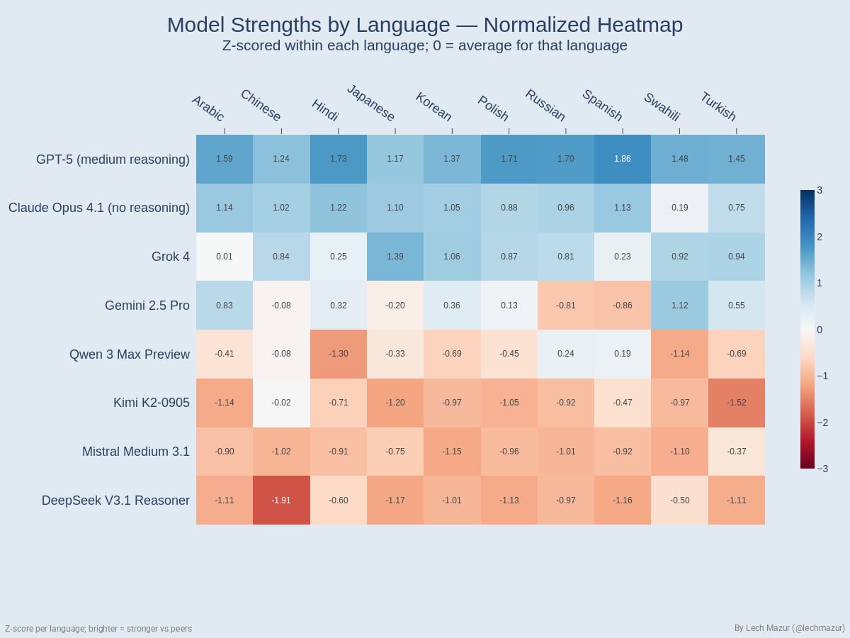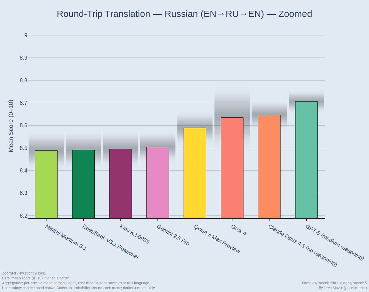 Хуже всех с переводом русского языка справляется Mistral Medium 3.1 (из тех кого протестили) Gemini 2.5 Pro кстати тоже результаты в русском языке, показала даже хуже среднего.. внезапно... и в испанском он тоже слабовата...