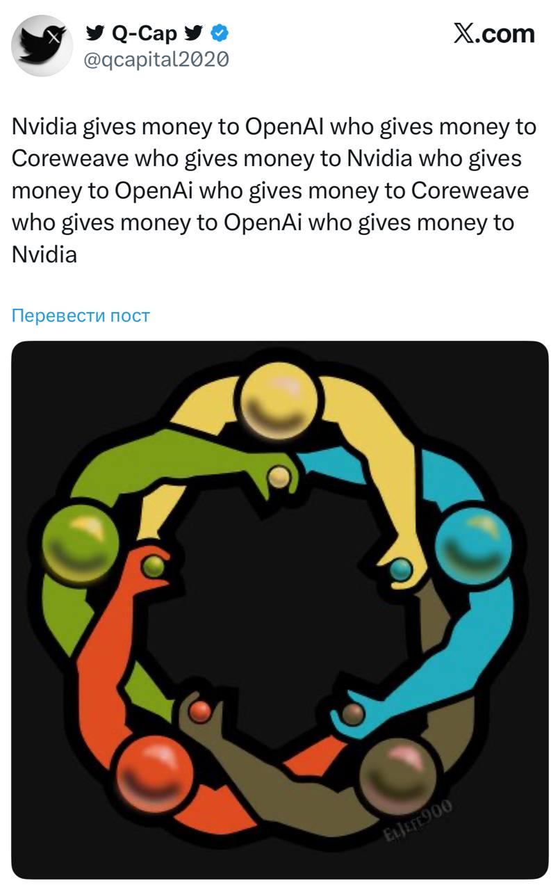 Комментарий от меня: конечно это не так, в этой схеме OpenAi всё остаётся должников 100 лярдов, потому деньги не из воздуха, но выглядит забавно и комично, да.