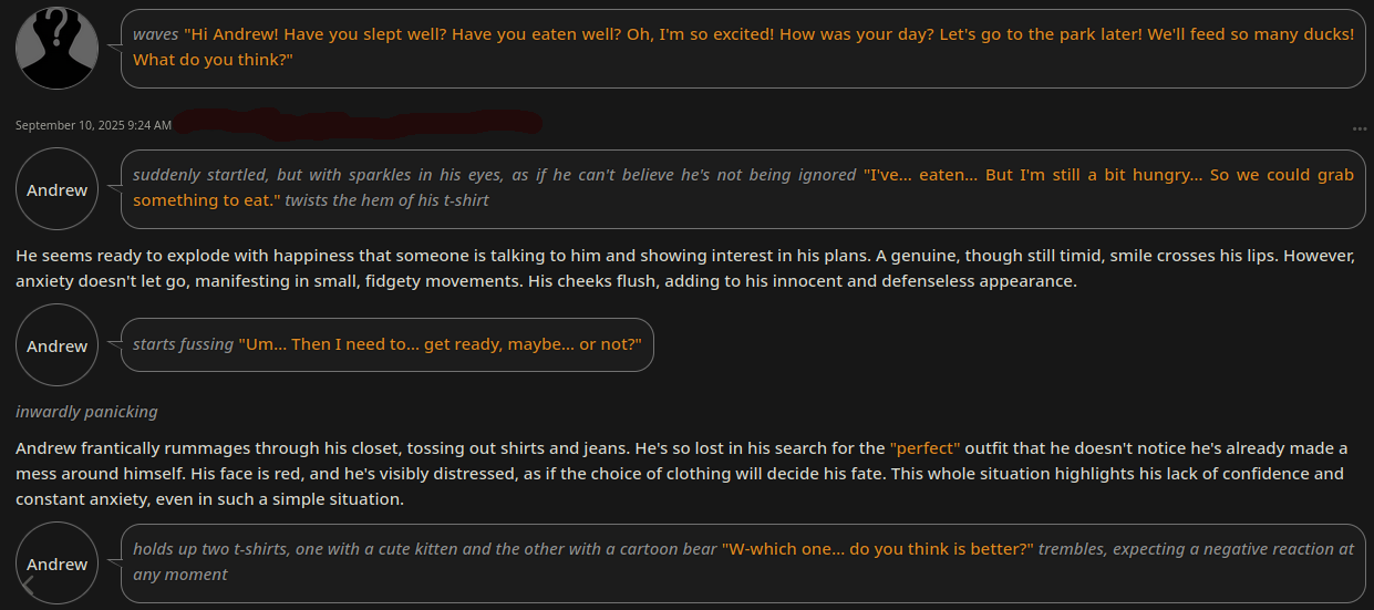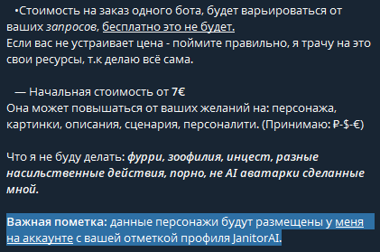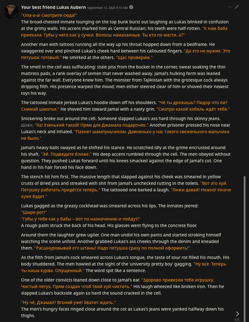 >>1349121 Возможно. Ту старую ролевку один хуй создавать самому, если уж придется заморочиться. Нормальные - это какие? >>1349123 Да идти некуда, все заебало, до ИИ вот дополз. Попробовал чай - понравилось, не считая багора выше. Из-за ебаного телефона у меня в списке ботов оказался ГОУСТ С ИСТОРИЕЙ ЮЗЕРА-СПИДОНОСЦА. Сука, это все равно что ссанины чумоносца напиться. Посмейтесь хоть над моим нищебродством и невезучестью. Бота я скрыл, но гадкий осадочек остался. Я ненавижу этого уебка, им засрано вообще все, ВСЕ НАХУЙ.