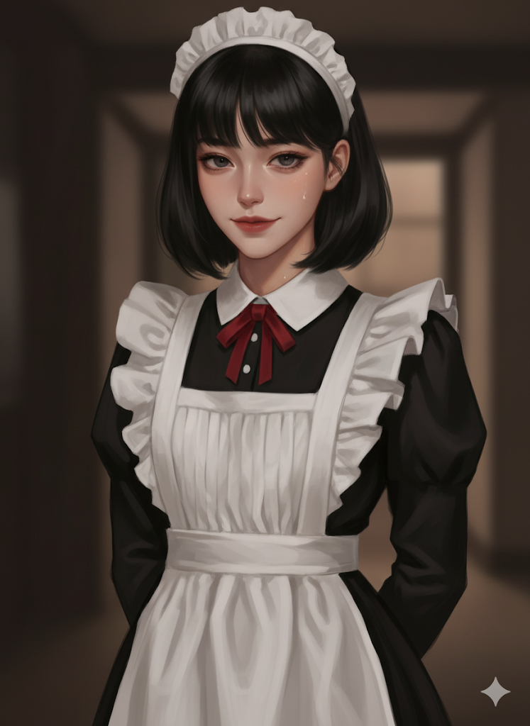 >>1347381 Semi-realistic maid character with a Korean pop idol-inspired face. She has a blank stare, half-open eyes, and a subtle smirk. Her skin looks slightly wet and reflective under soft lighting. The perspective is from below, emphasizing her presence. She holds a cigarette in one hand and a bottle of beer in the other. The overall mood is moody and stylish, with a slightly edgy, rebellious vibe. She is sitting on a sofa. Keep the hair style