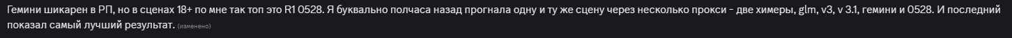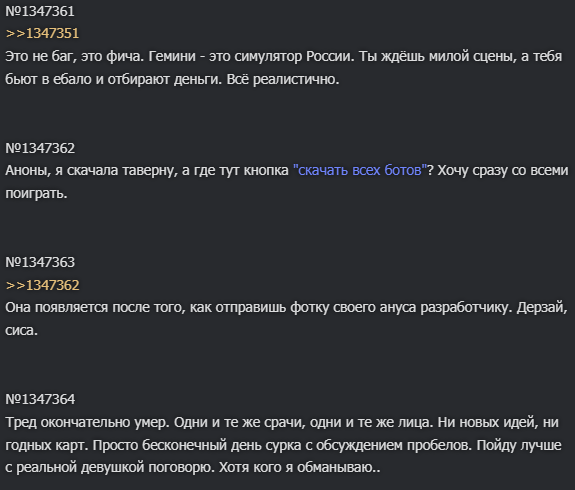 Начал спрашивать про тот же самый RAG — и Гемини мне рассказывала, как все участники дискорда таверны коллективно хуесосят этот ебучий RAG. Потому что если ты подключаешь не полезную инфу, а, например, фанфики, то некоторые модели начинают путаться: где примеры фанфиков, а где сам фанфик, который они сейчас пишут. Мне кажется, они просто хуёво промптили, без заветов хмлшиза.