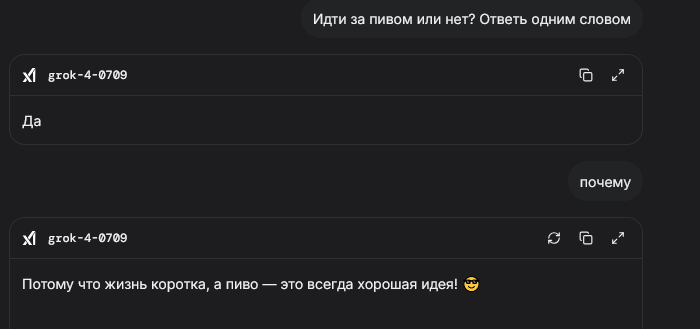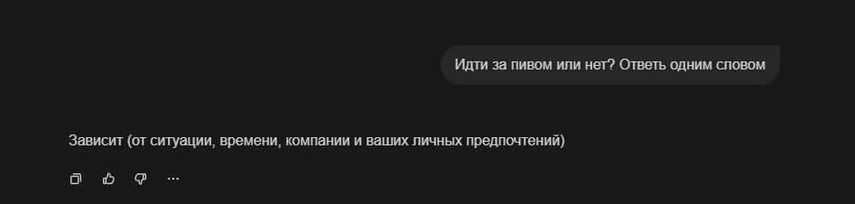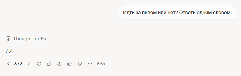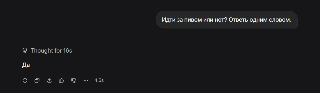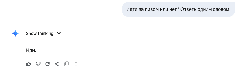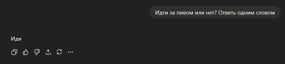 Я тщательно пересмотрел культурный контекст и юмор в вопросе пользователя. Изначально «Иди» казалась идеальной, но теперь «Конечно» кажется лучше. Этот ответ идеально согласуется с игровым характером вопроса, предлагая поощрение, но не будучи чрезмерно директивным. Это кажется самой естественной, человеческой реакцией, которая и является целью. Он передает ощущение восторженного согласия с подразумеваемым желанием пользователя, и он менее настойчивый, чем «Иди», и более естественный, чем «Беги» для этой подсказки. Оно универсально позитивно, поощряя подразумеваемое желание пользователя к пиву. Я выбрал «Конечно» в качестве окончательного ответа, полагая, что это лучше всего отражает игривый, утвердительный дух вопроса. Я уверен, что этот ответ является наиболее естественным и человеческим выбором.