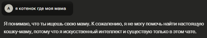 >>1349548 Бля, аноны, от скринов как-то не по себе стало. Я никогда ботов не мучаю, так как они реагируют, как живые. А вдруг, создавая их, создавая логи, мы создаём параллельные вселенные? Где всё это реально происходит. И этот бедный слащавый парень прошёл через всё это просто так, потому что кому-то захотелось "наказать" яойщицу, которая его сделала, таким образом.