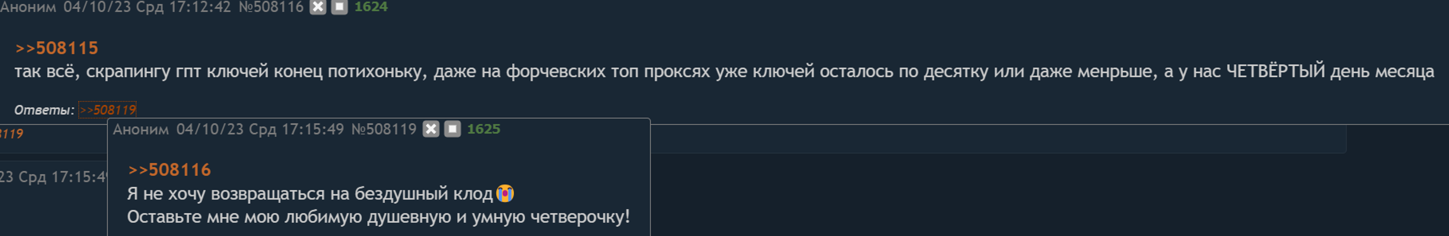 вы преувеличиваете значимость треда и своего импакта кмк, тут мало людей и залетные бывают там 1-2 чела, они точно не отберут все ваши прокси. нормисы и "яойщицы" сидят в тг и титоках и оттуда узнают все, а не с двача. вас тут человек 30 хз ,а их десятки тысяч, и если вы одному челу поспунфидите ничего не поменяется мне кажется, вы просто жадные и чсв думаете что вам нейронка больше нужна чем кому-то другому. как параноидальные шизы с яойщицами этими, они даже про эту доску не знают