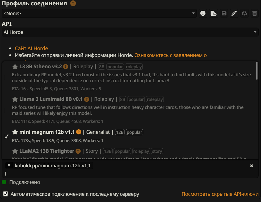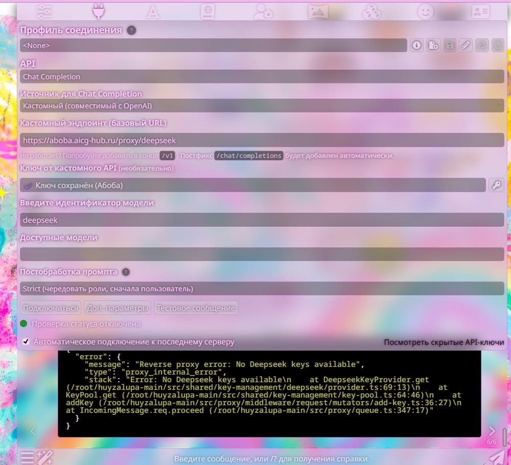 >>1349057 >>1349060 >>1349068 >>1349069 Короче похуй, оно того не стоит так заморачиваться. >>1349063 Хорду нашел, подключено, а дальше что, это бесплатная болтовня? У них там Серафина какая-то болтает, но ее слова почему-то не переводятся, таверна шлет нахуй с ошибкой сервера.