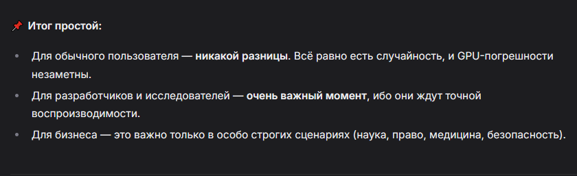 >>1349312 Ну я делал похожее, но мне важно было что бы оно реально отвечало правильно, типа давало ответы на популярные глупые вопросы как ассистент. Но у меня был локальный лоботомит вообще, по этому я ему прям целый промт ответов вопросов кормил, но верно подметил, особенно если это умная модель то она и так все шарит и можно температуру нормальную ставить с низким шансом на получение ответа в виде неверной придуманой хуйни. Но всё равно в чем-то совсем локальном в дваче промт ответов-вопросов лишним не будет.