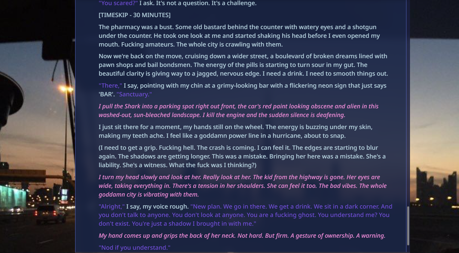 >>1349676 да просто слайс оф лайф, на машине катались, в баре сидели... потом еще всякое, сэкс.... много времени тратится на свайпы ошибки и генерации правда