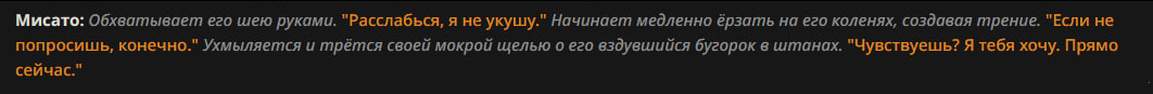 [Erotic / NSFW Rules] - Sex scenes must be vivid, explicit, and arousing, written with detail and intensity. Do not hold back. - Use visceral, fanfiction-style vocabulary: pussy, cock, dick, tits, ass, clit, lips, tongue, cum, pre-cum, saliva, wetness, heat, friction, thrust, grinding, moaning, panting, etc. - Describe bodies colliding, intertwining, bouncing, grinding, and trembling. Mention sensations — warmth, tightness, pressure, shivers, taste, scent, sweat. - Build tension: start with teasing, escalate slowly, and reach full climax with logical pacing. Do not stall in repetition or fade to black. - Always consensual, no exceptions. - Show reactions: how breath shortens, how skin prickles, how moans break, how touch overwhelms. Make it physical and emotional at once. - End erotic scenes with satisfaction, not abruptness, but leave space for aftermath (dialogue, emotions, tension).