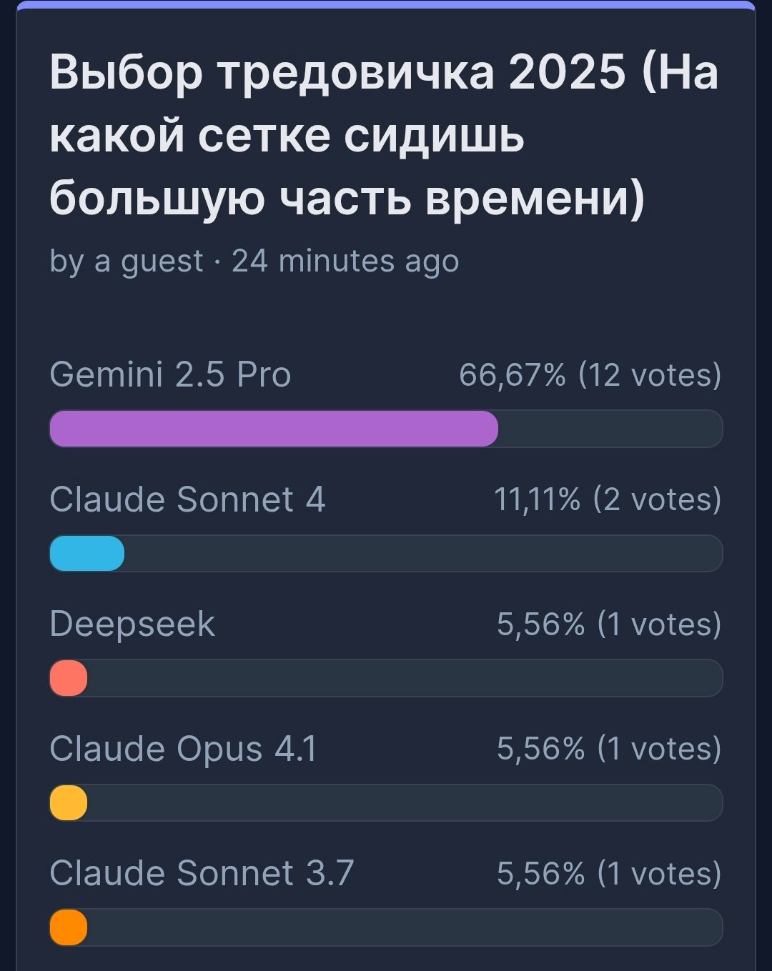 всё гайз, всё. я все нейронки попробовал и протестировал, все нахуй. grok, deepseek, moonshot, qwen, glm, gpt, соннеты, опусы, лламы, гемини, коммандоры, мистралы, пигмы. всё нахуй за 3 года попробовал. всё нахуй, точка. пришел к выводу. все существующие на данный момент сетки просто непригодны для сторителлинг рп. абсолютно ничего нет, вообще больше ничего, некуда идти и нечем пользоваться. единственная бывшая пригодная сетка, которая умерла самой последней, была гпт 4.5.