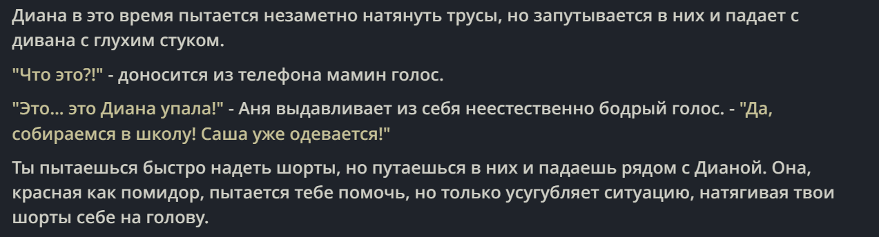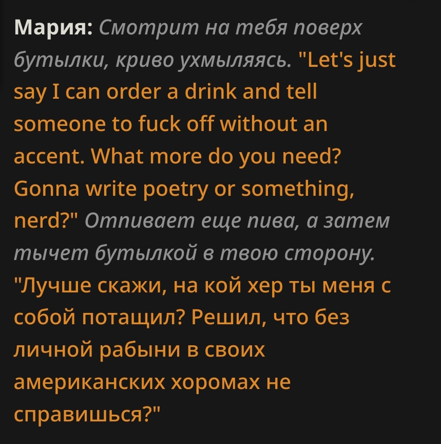 А другие будут доказывать, что нужно погружаться в персонажа, описывать речь, действия, возможно эмоции, как в текстовых ролёвках с живыми людьми, "Кино на входе - кино на выходе" и так далее.