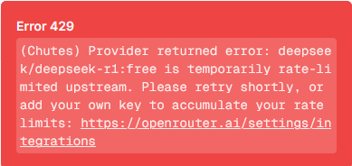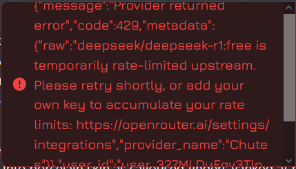Да чё за хуйня сёдня весь вечер с deepseek-r1:free. Только у меня? Настраивал всё по гайдику который тут постили давно. Неделю наверн обдрачивался спокойно, а терь это.