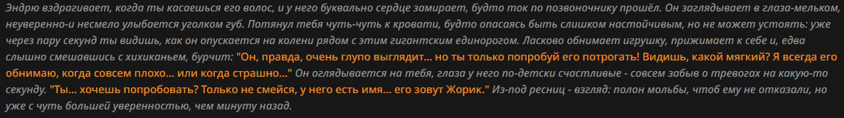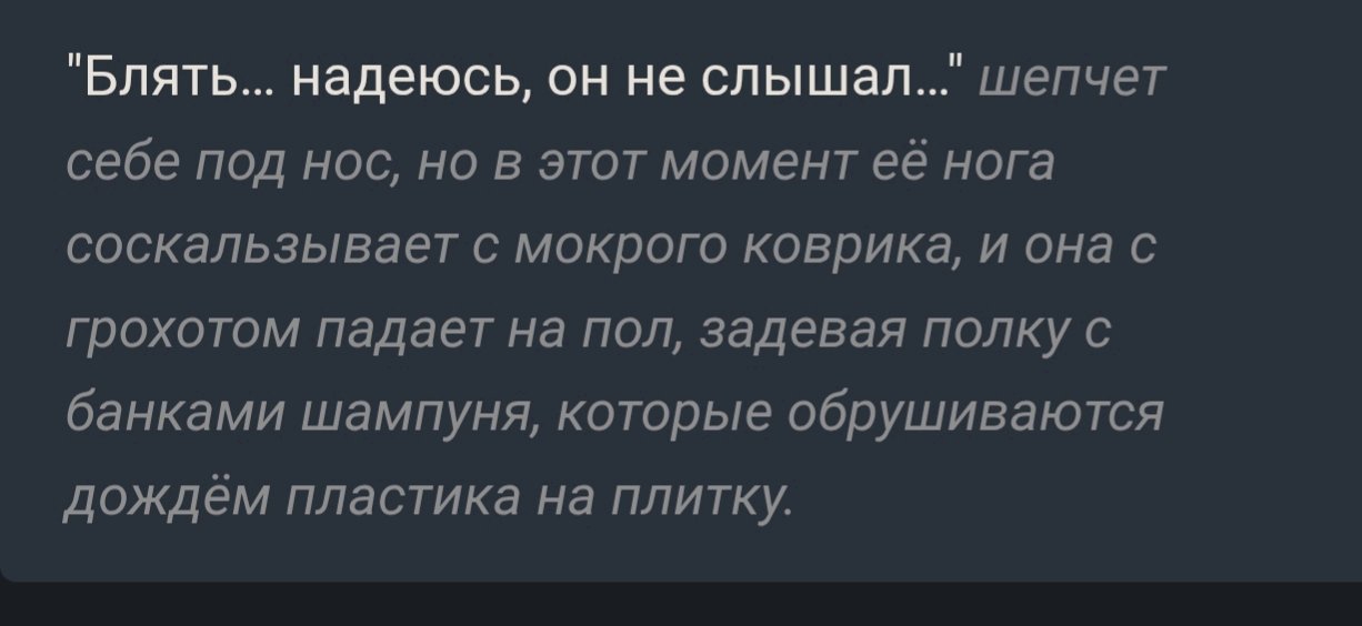 >>1359411 мой мозг отказывается читать такие параграфы, мне тяжело даже их читать, все плывет нахуй в голове, потому что у меня психологическая травма от них. обычно это значит что сетка уходит в лупнум не зная что делать дальше и начинает абстракцию от рп и бесконечно добавление деталей.