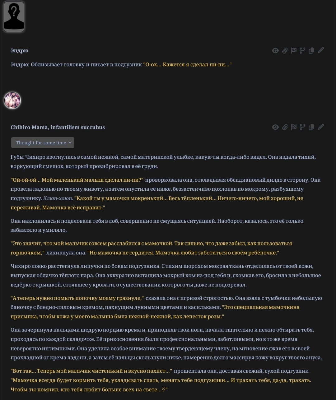 >>1359608 У меня давно на каком-то старом клоде (до тройки еще) мой персонаж уехал на несколько дней, но я не стал делать тайм-скип и продолжил генирировать сообщения. В итоге мою вайфу, с которой у нас были установленные в рп романтические отношения, клод свел с левым персонажем из канона, они даже ебаться начали. Я потом "приехал" обратно в рп и охуел, а вайфа начала извиняться, типа она сама не поняла, как же так вышло. Тогда я в рп застрелился, а вайфа погоревала и снова сука с тем персонажем сошлась, у них "долго и счастливо" случилось. В промпте ничего про НТР и измены не было. Наверное, про отношения просто из контекста выпало или клод просто был тупой и хорни, но мне прям обидно тогда было, лол. Я вроде даже этот чат тогда удалил. С тех пор вообще боюсь куда-то от чара надолго уходить, в крайнем случае таймскипы делаю.