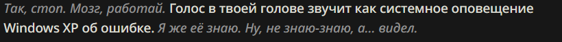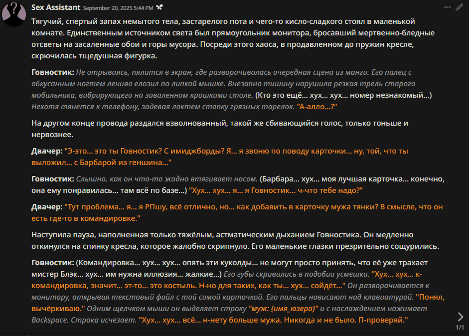 >>1360872 Чел там карточка про девочку инцелиху, у меня так и было пока я сам не начал переписывать некоторые вещи в порыве ебанизма, а читать ее мысли на русике вообще атас